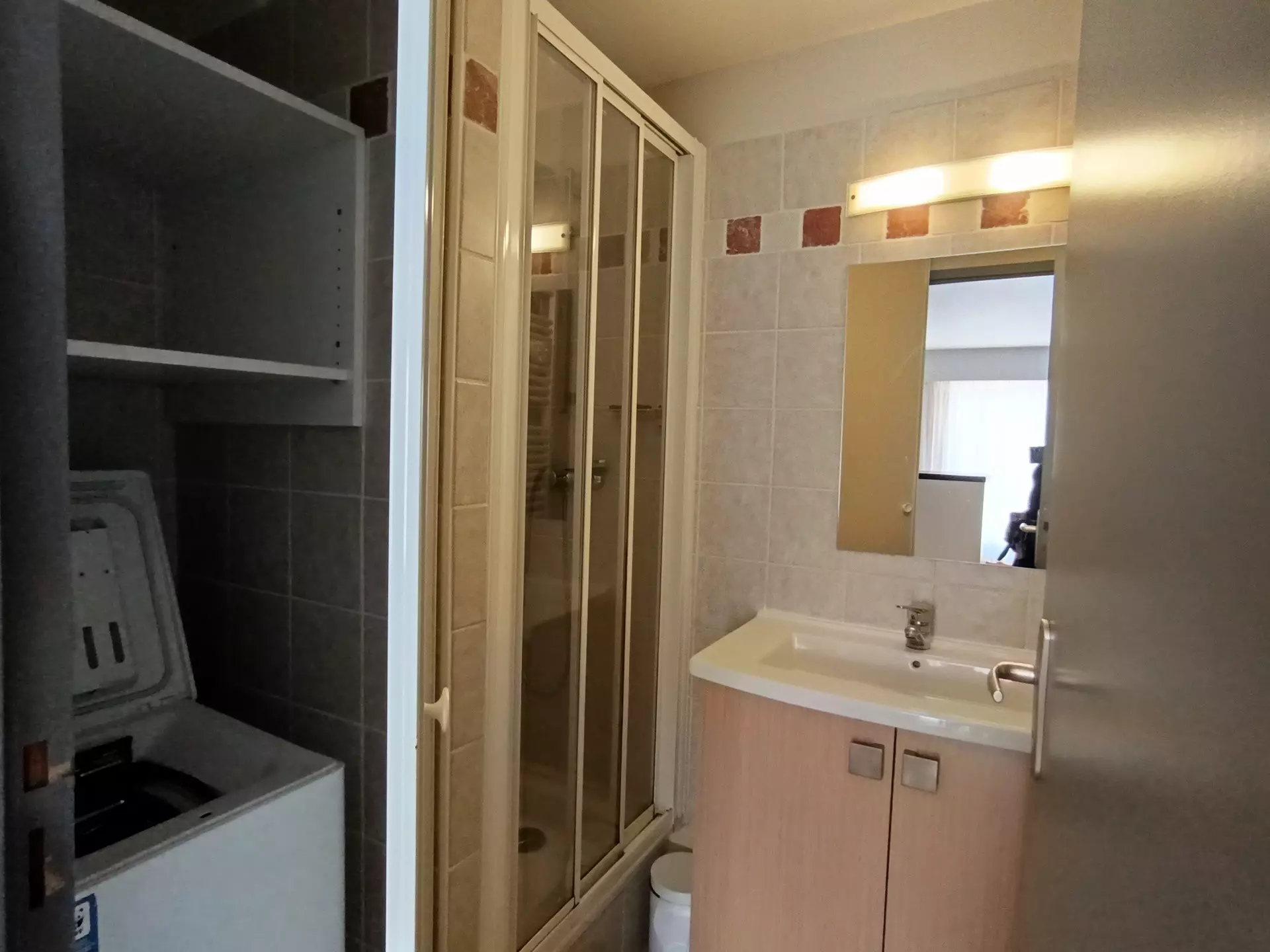 Shower room: Shower cubicle with shower screen, vanity unit with sink, large mirror, electric heated towel rail, washing machine, storage.