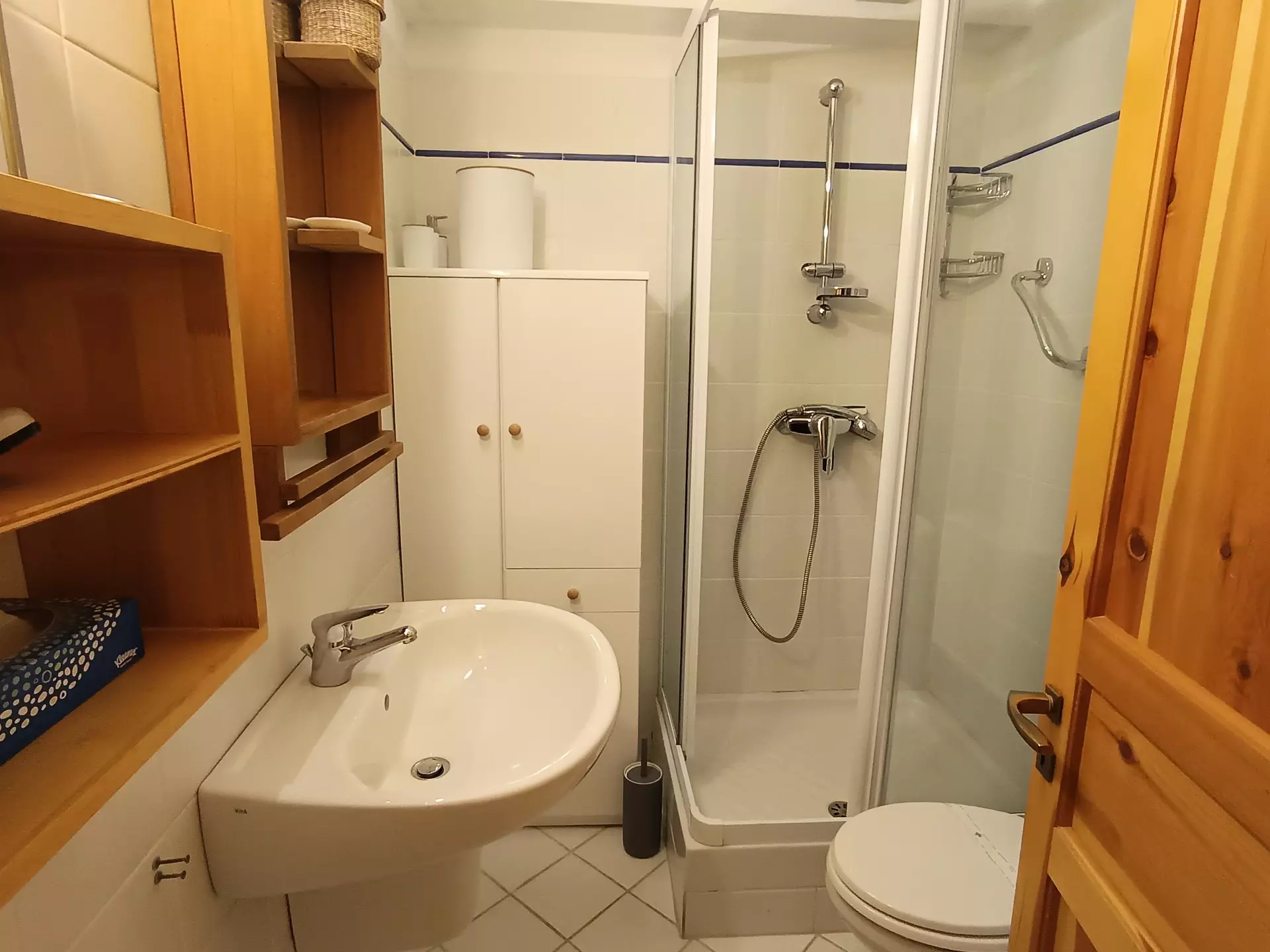 Shower room: Shower cubicle with shower screen, sink, mirror, toilet, washing machine