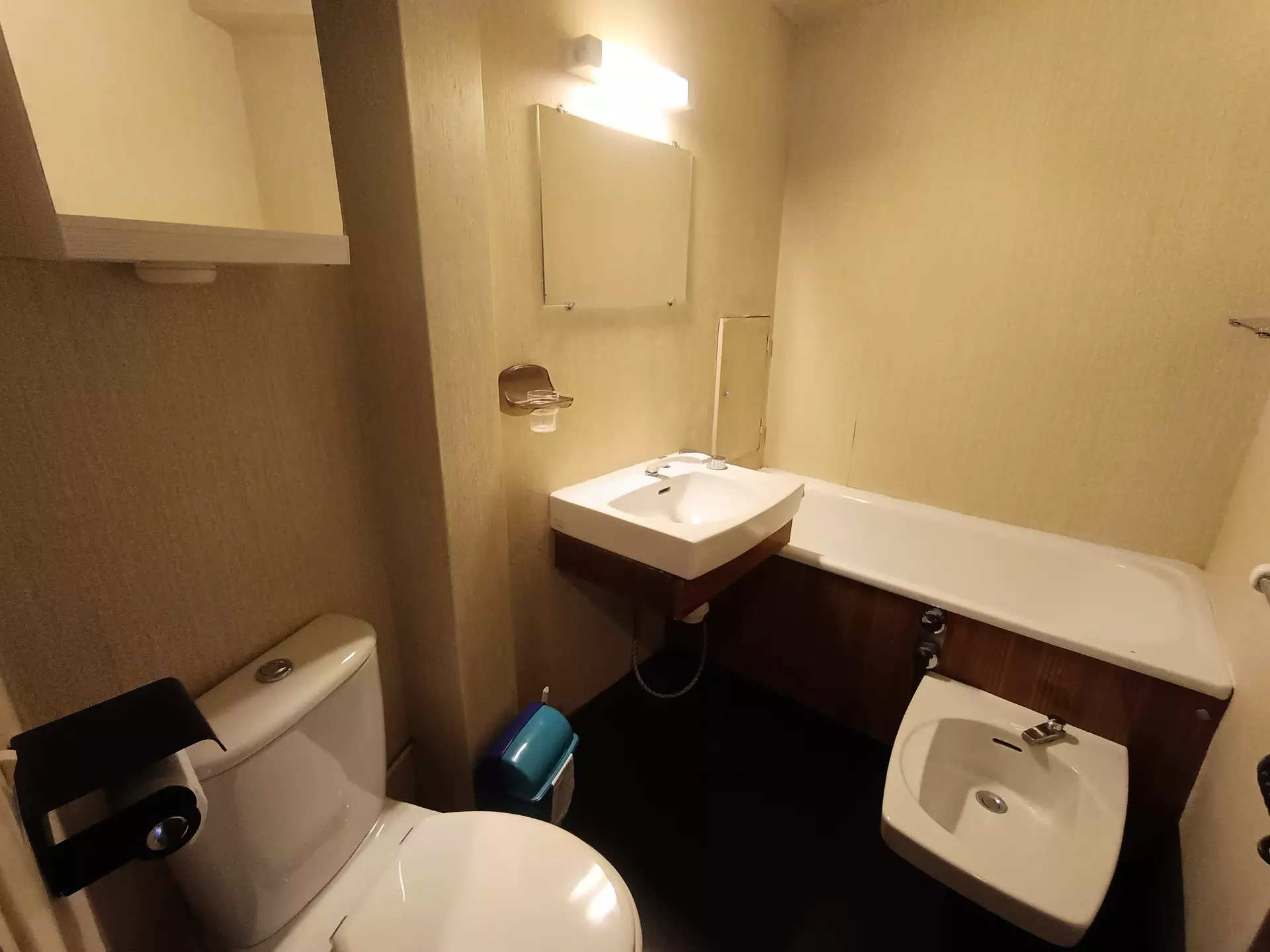 Bathroom: Bathtub, bidet, sink, toilet, towel racks, mirror, shelves.