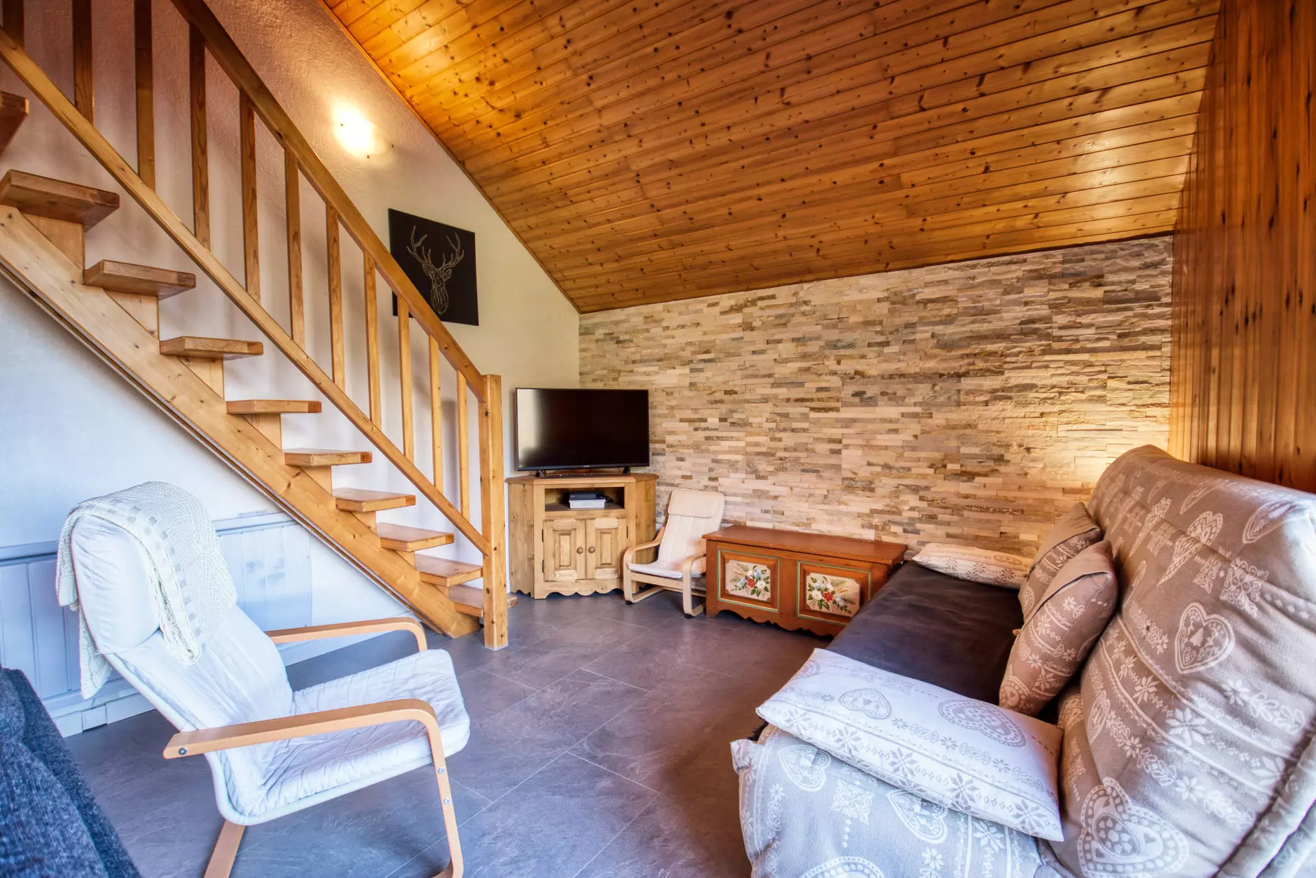 After climbing a staircase, you'll be greeted by a spacious, carefully decorated living/dining room, including a sofa bed and a television for your relaxing moments. You'll also find a beautiful dining room for sharing convivial meals. On the sleeping side, the apartment has three comfortable bedrooms, one of which is en suite with a shower. A pleasantly furnished mezzanine completes the sleeping areas and is equipped with a television. For your convenience, an additional shower room and a separate toilet are available.