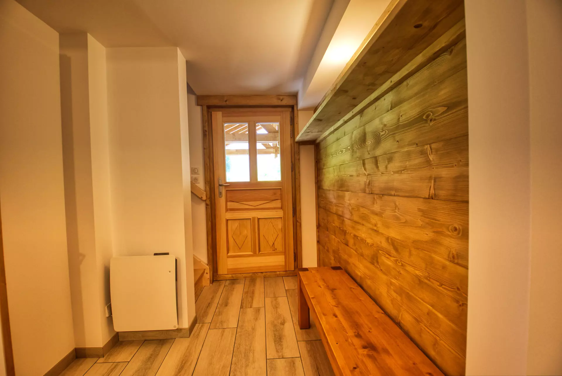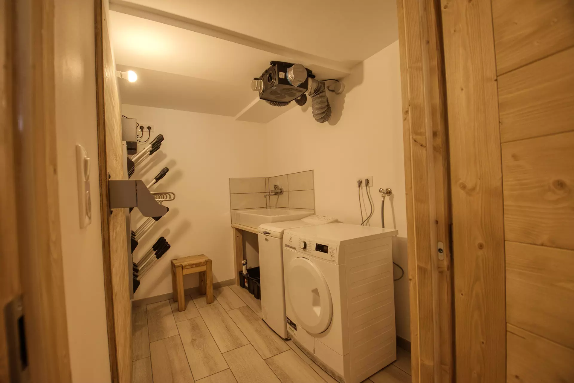 Entrance - 2 bedrooms each with a storage cupboard - 1 bathroom - 1 toilet - 1 ski locker with heated racks - 1 laundry room with washing machine - dryer - 1 refrigerator, 1 staircase to access the ground floor including: