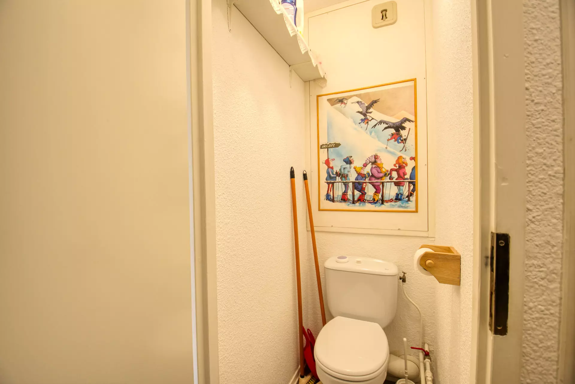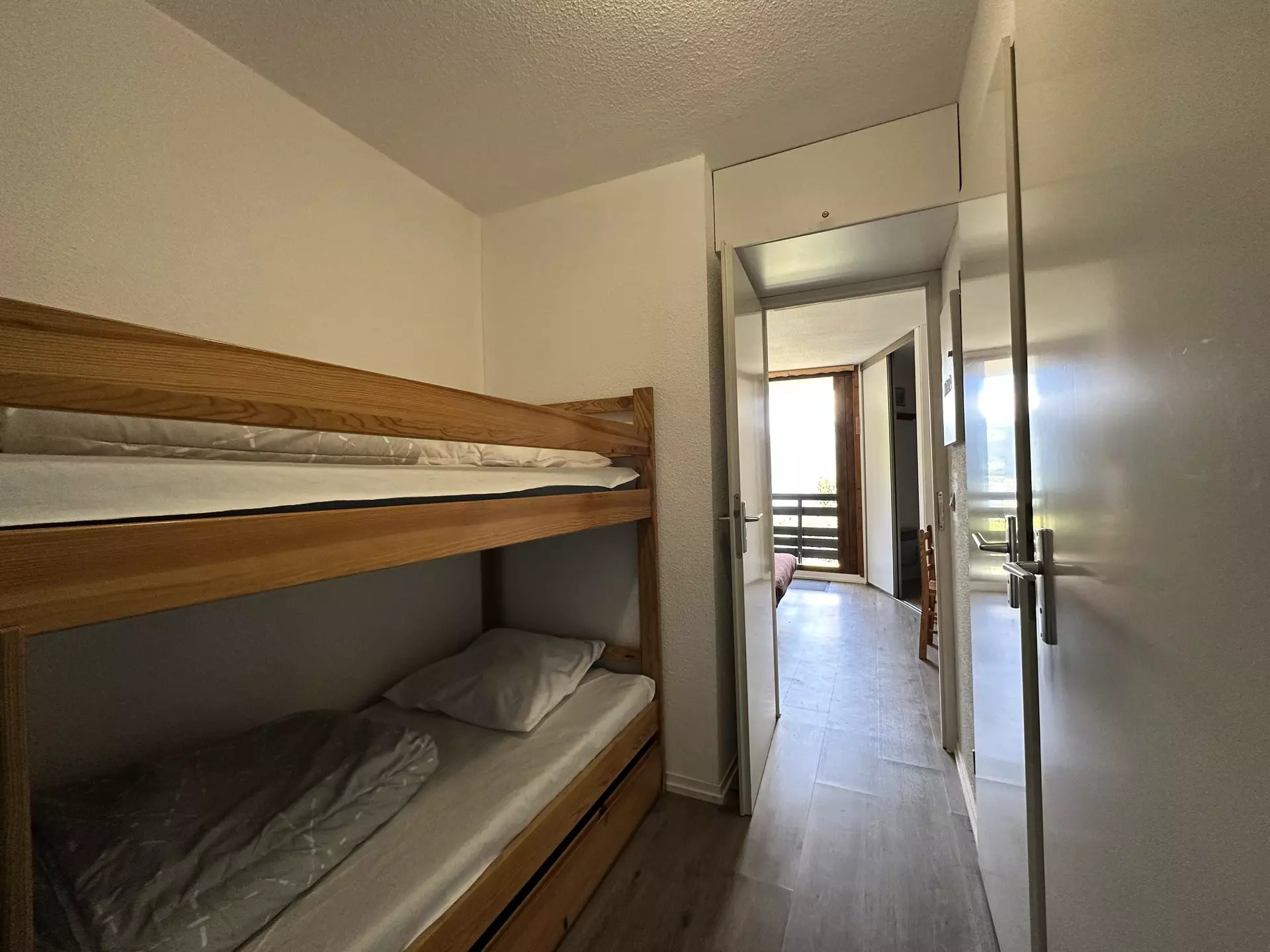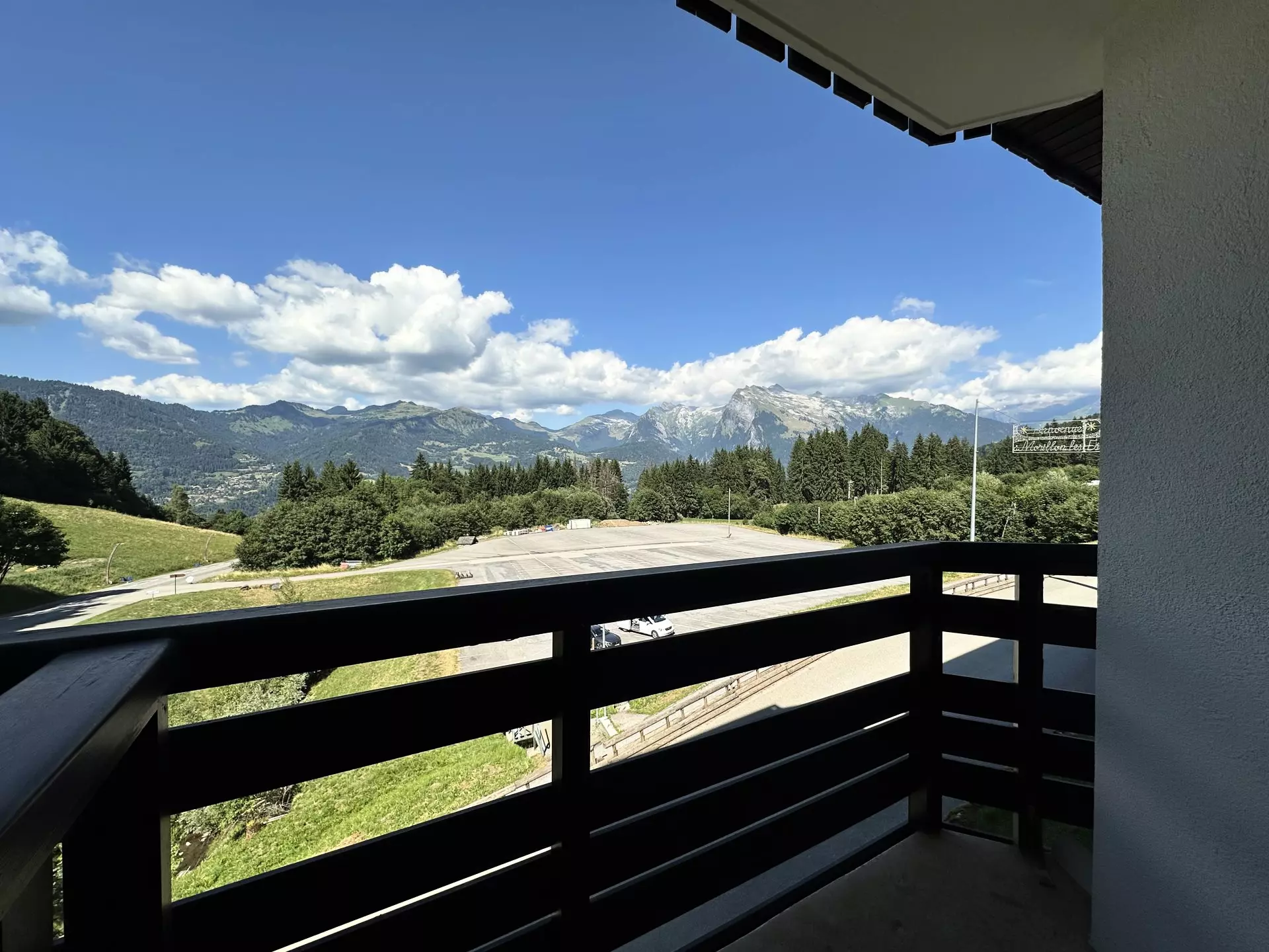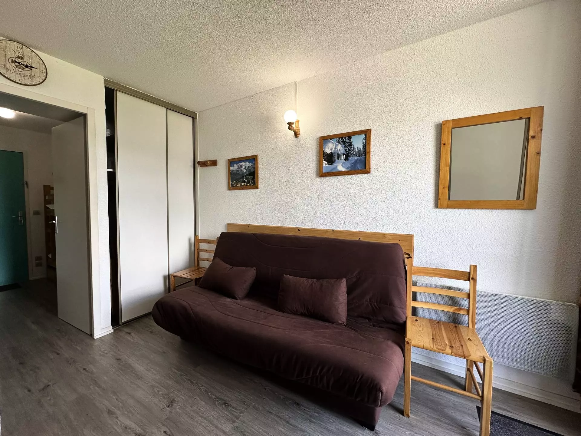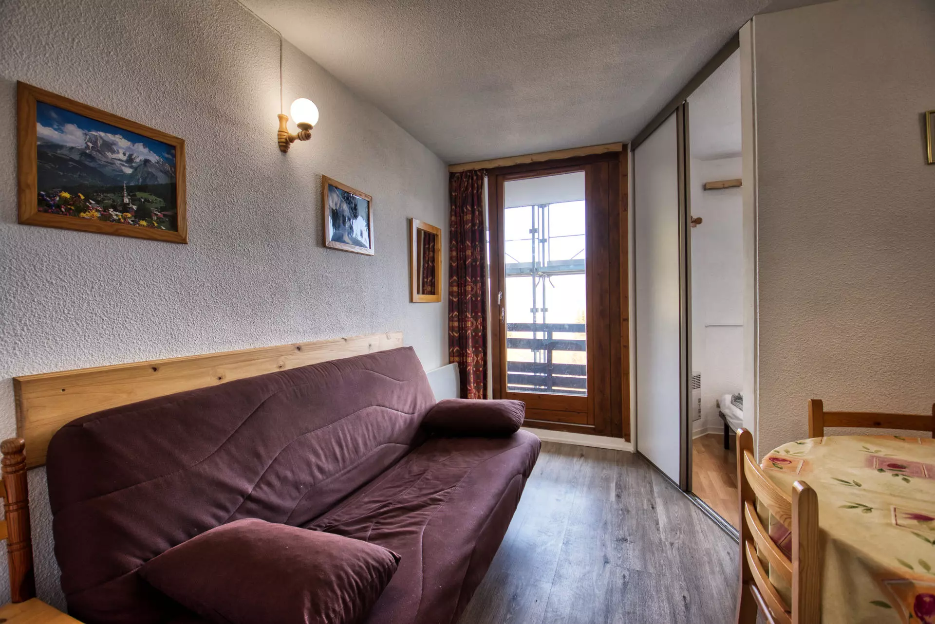 Upon arrival, you'll be greeted by an entrance hall featuring a mountain corner. You'll also find a bathroom with a bathtub, a toilet, a living room with a sofa bed, a television, and a fully equipped kitchenette. A small bedroom is closed by a folding door. Enjoy the north-facing balcony with stunning mountain views.