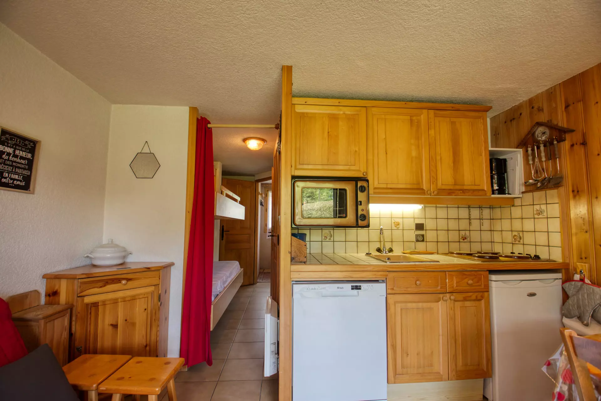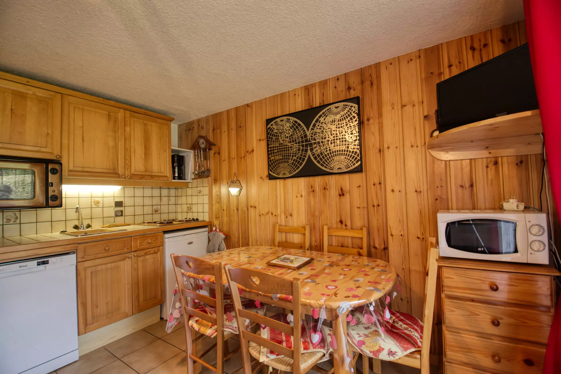 The kitchen is equipped with an oven, microwave, dishwasher, refrigerator, 4-burner electric stovetop, filter coffee maker, soup blender, fondue set, as well as all the dishes and cookware you need for your stay.