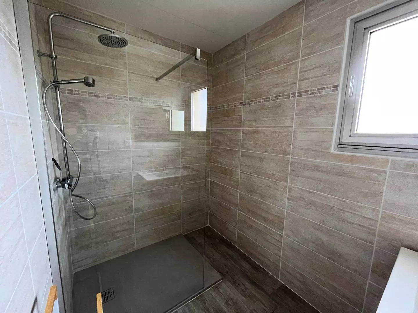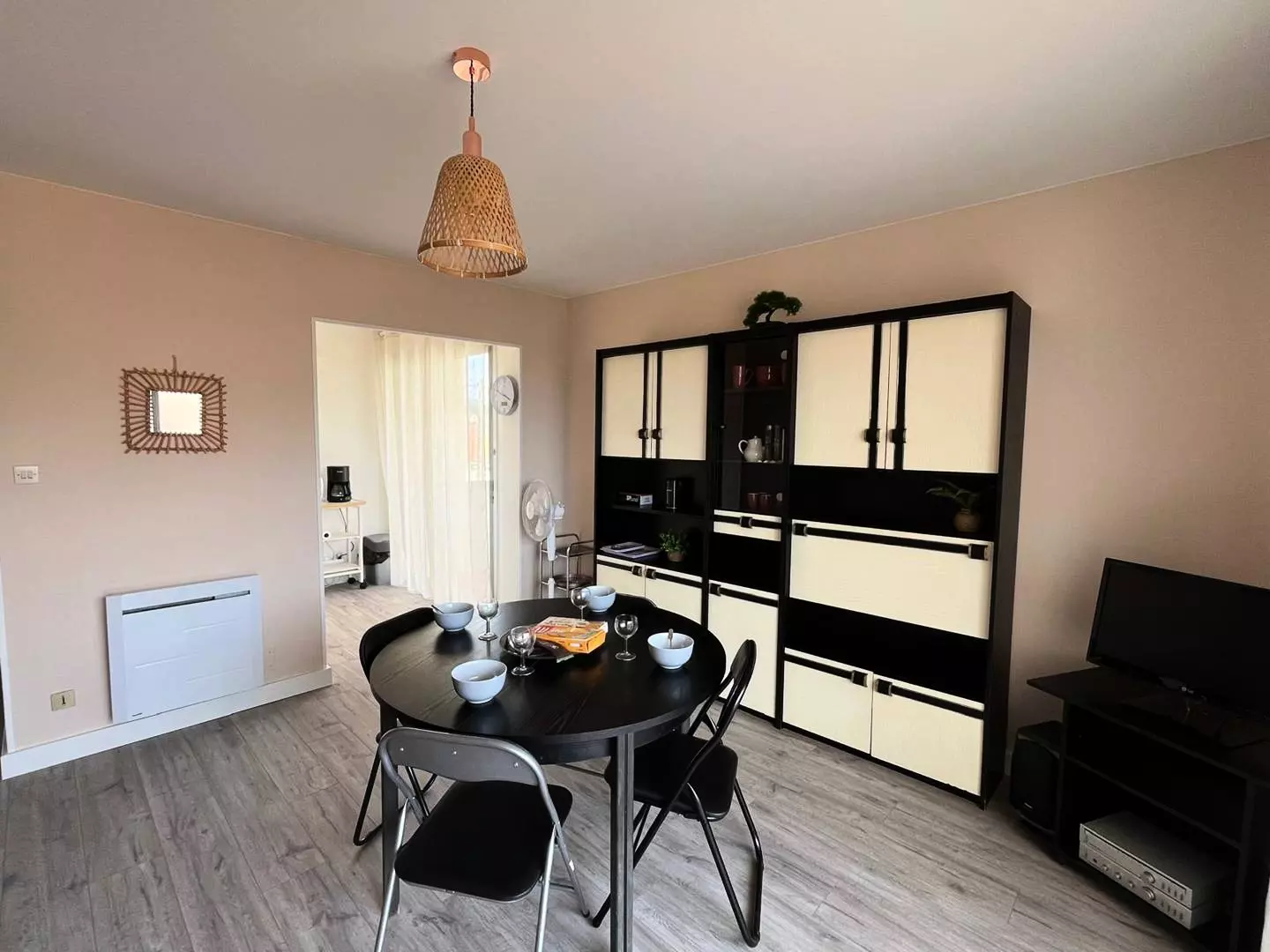 The living room leads to a bathroom and the sleeping area: a bedroom with a double bed (160cm) and built-in wardrobes. Fan.