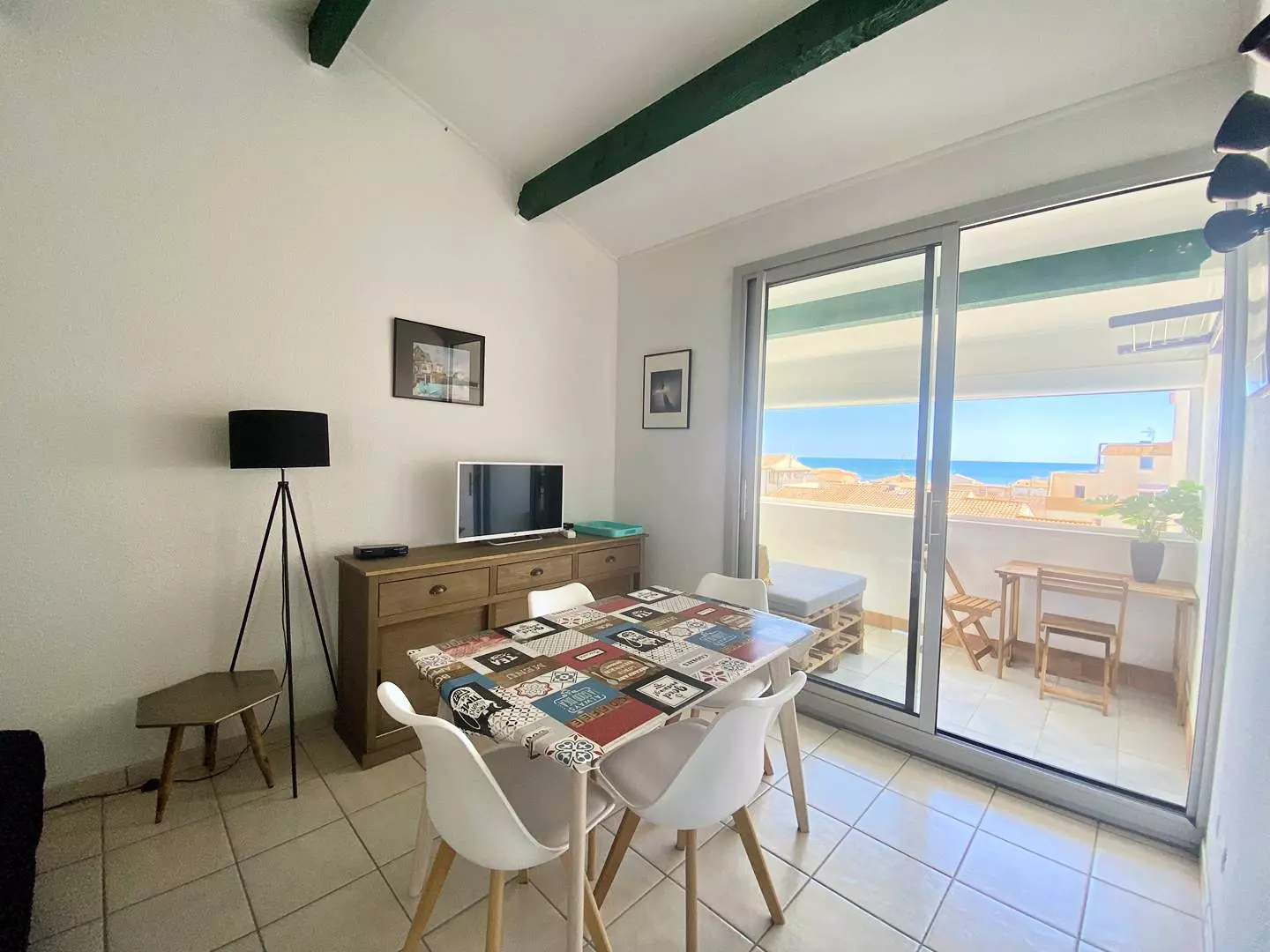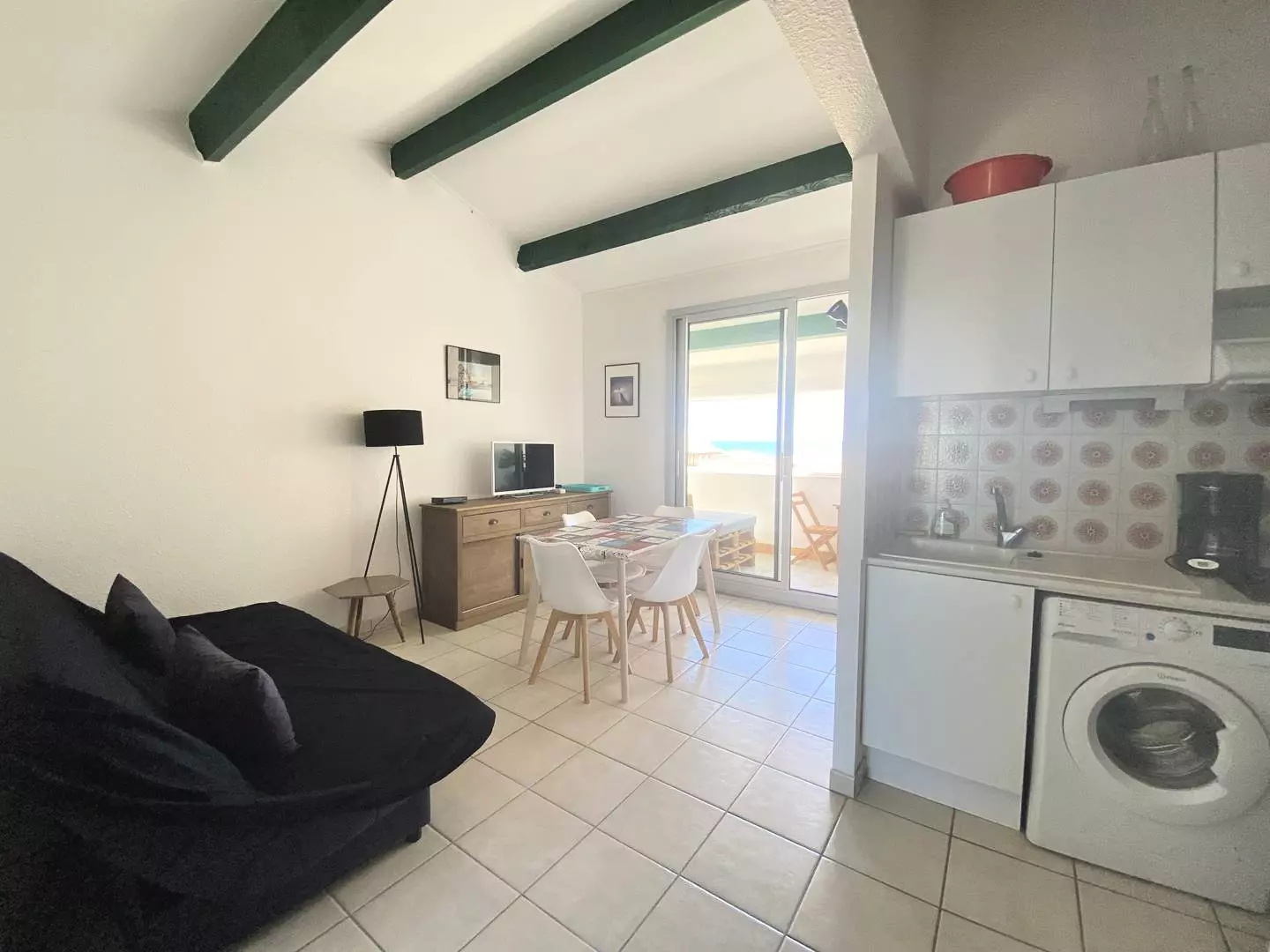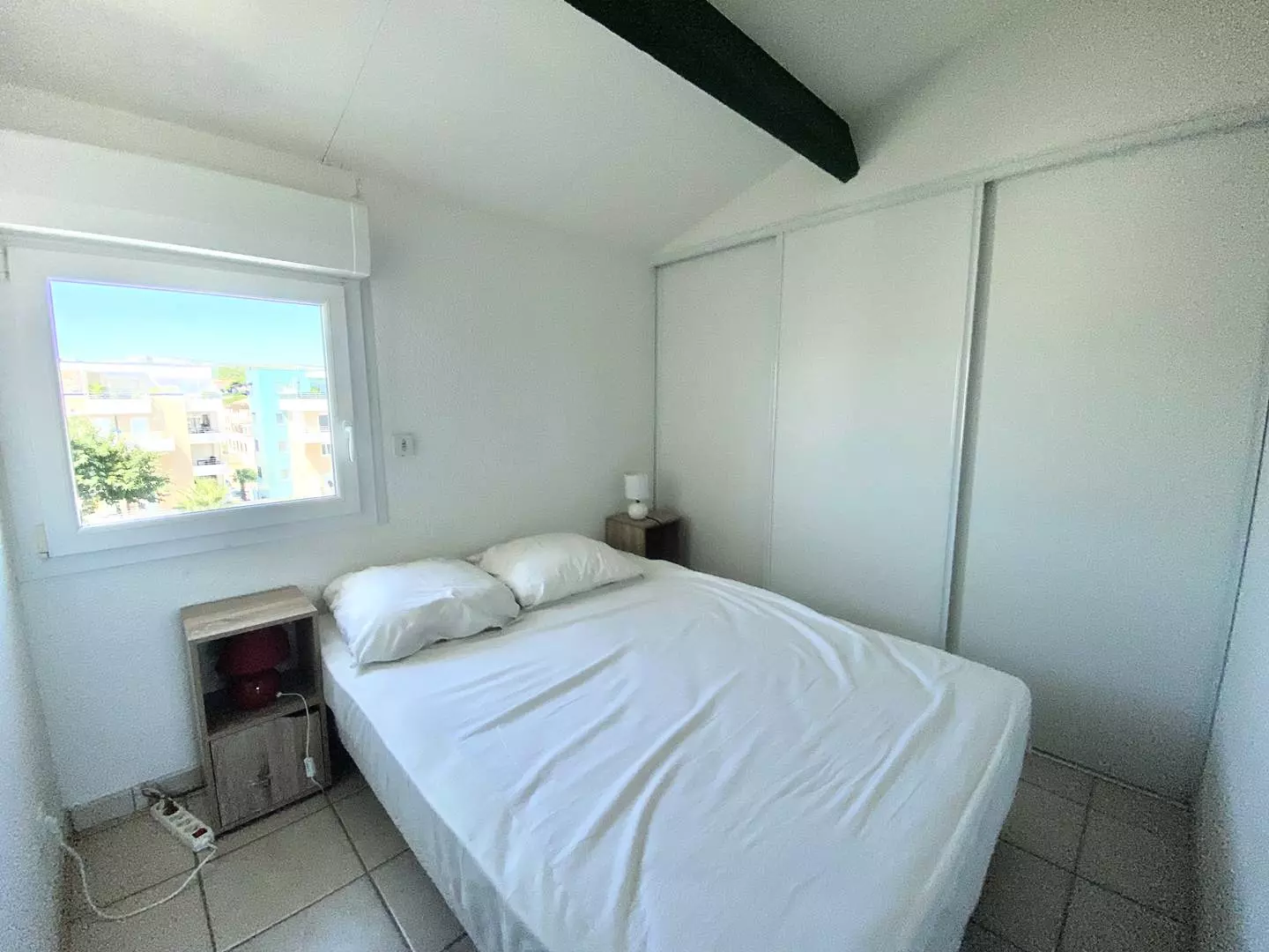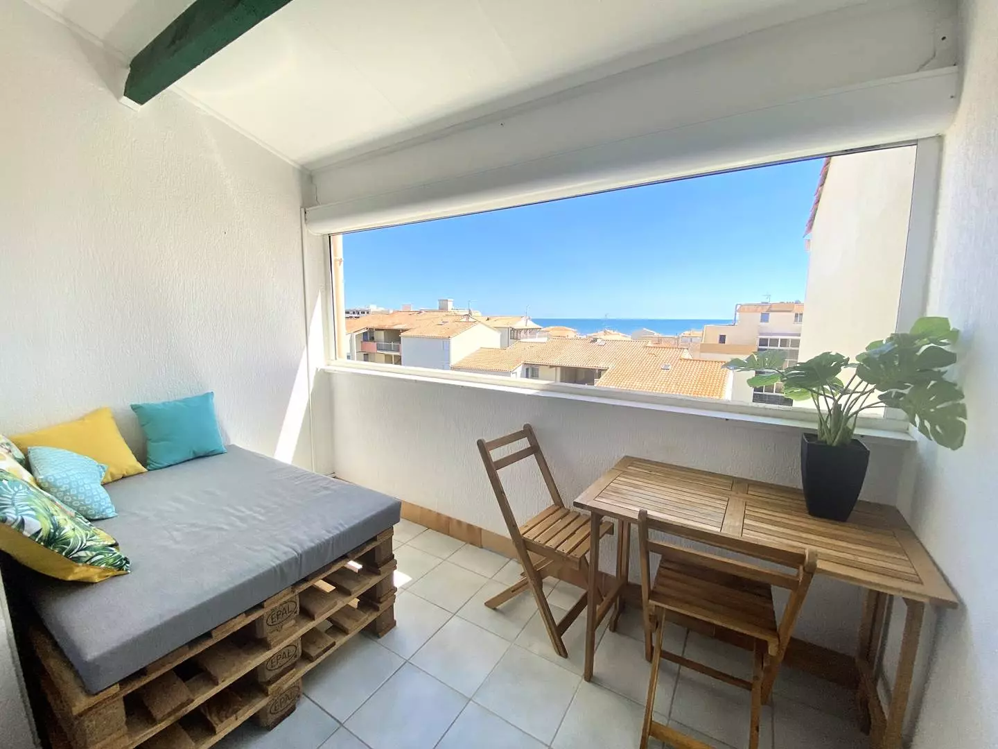 Loggia with sea view, two bedrooms, equipped kitchen (washing machine, fridge, oven, etc.) and shower room.
