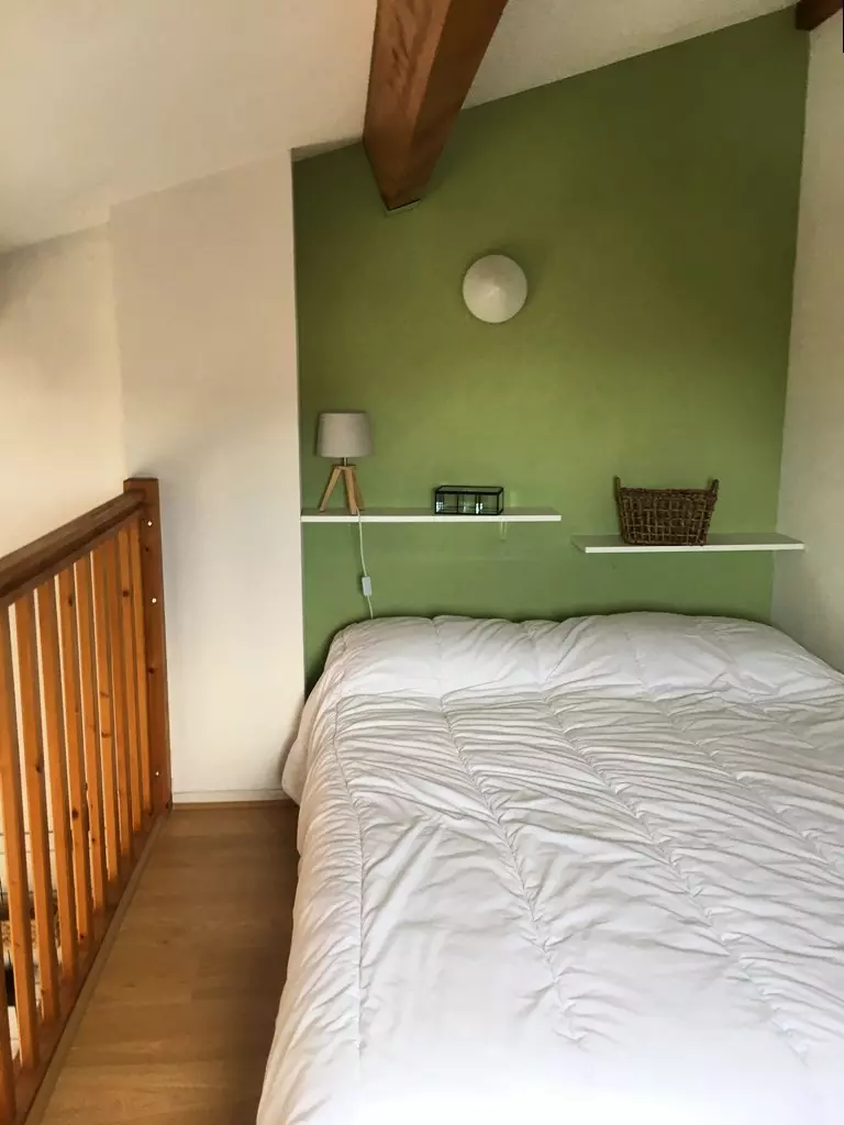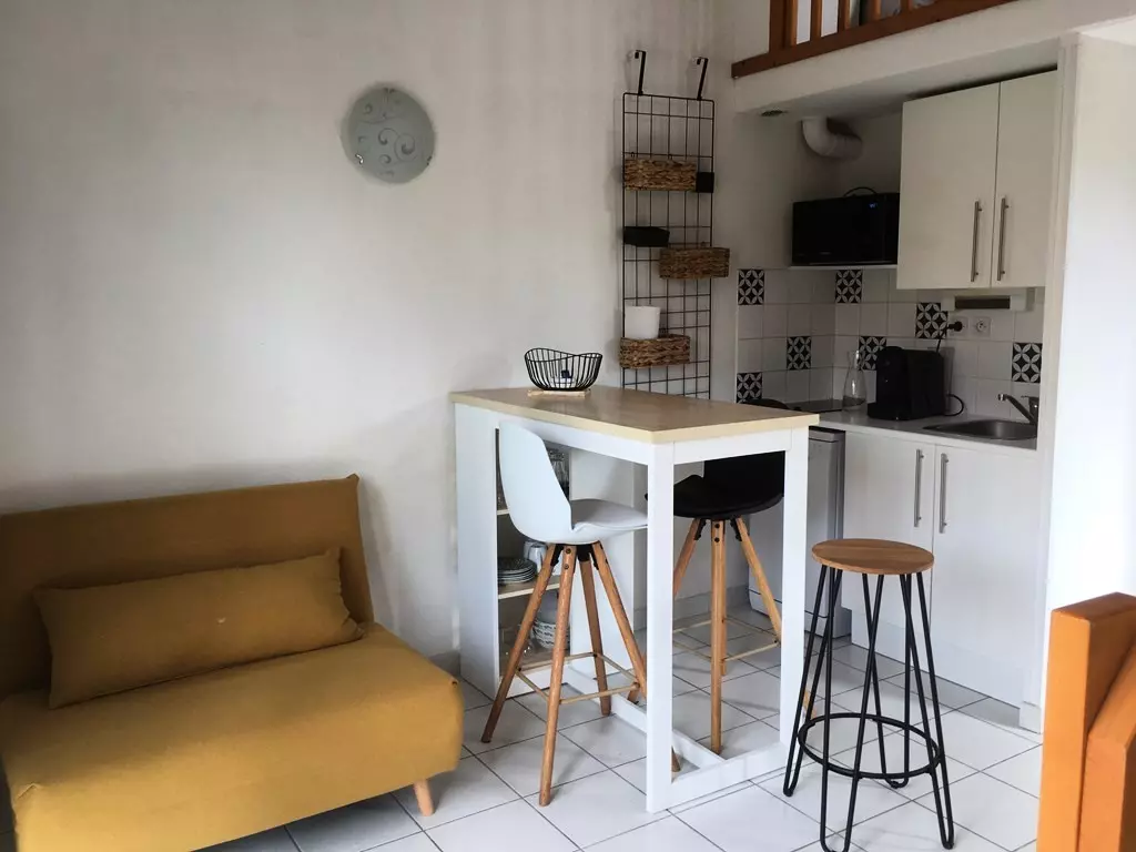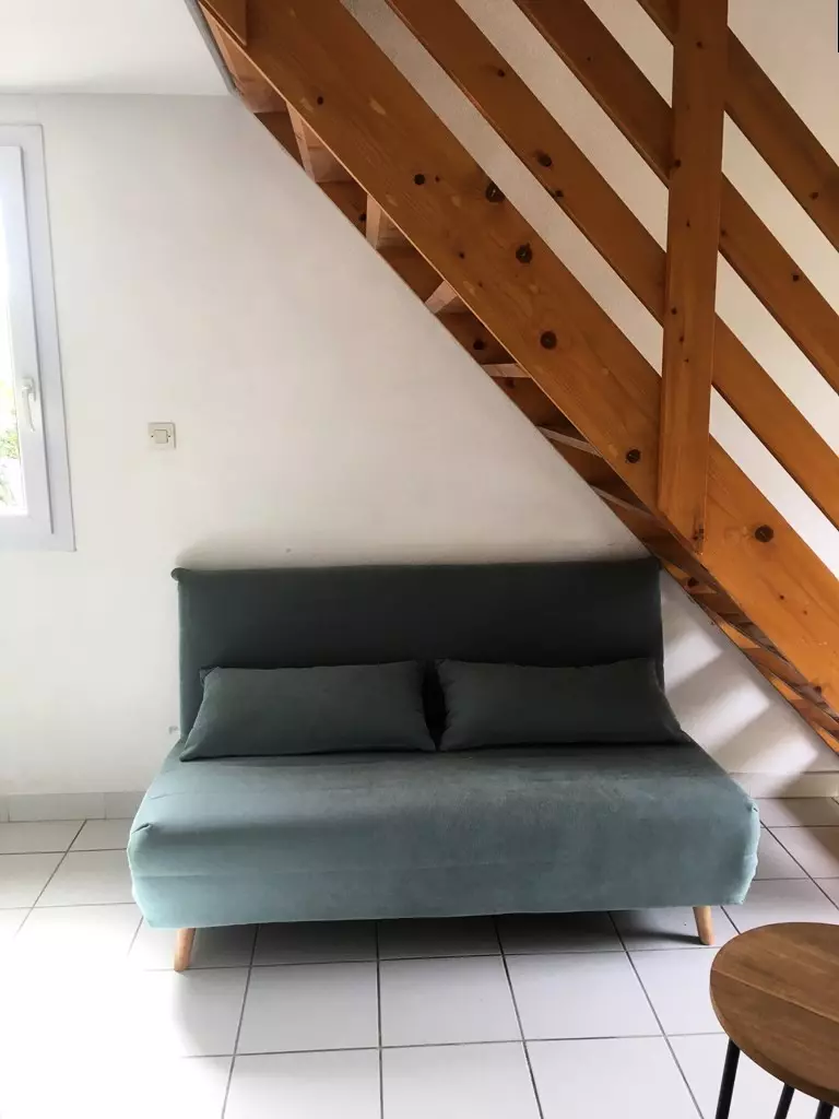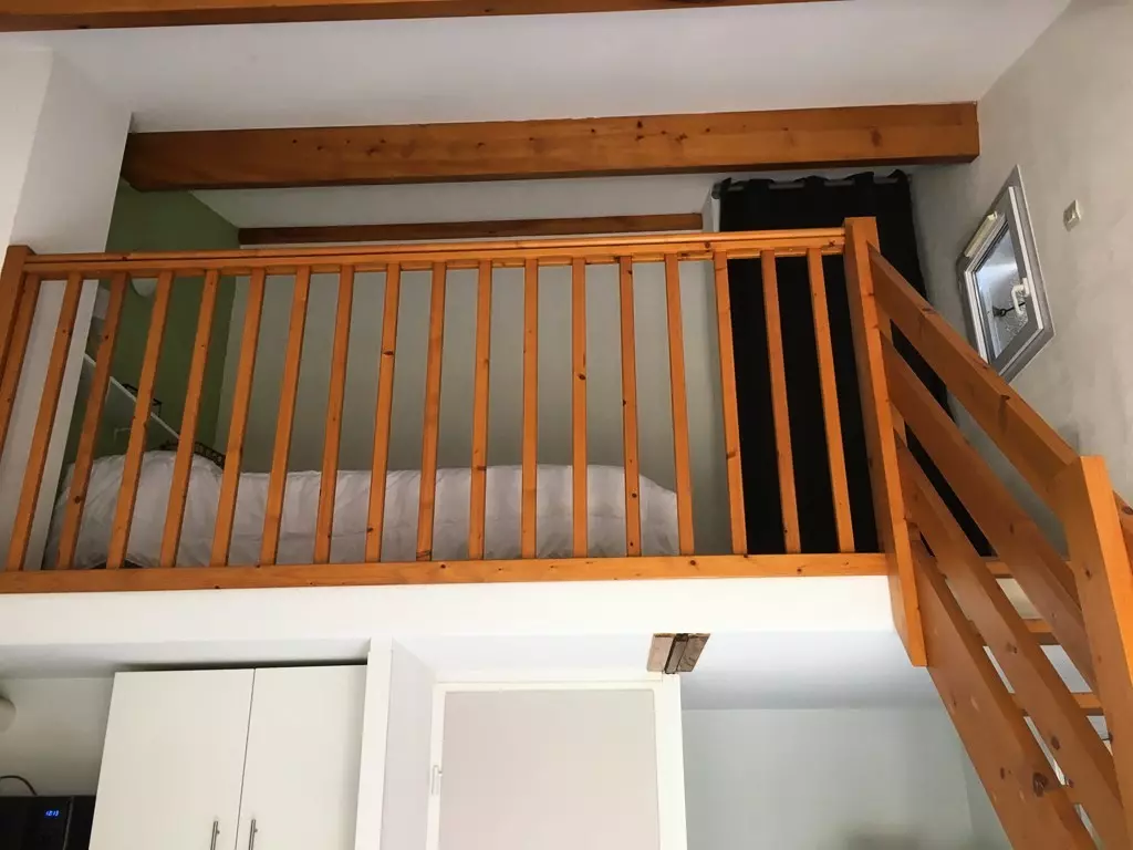 It has a living room equipped with 2 sofa beds, a kitchen area, a shower room and WC and upstairs, a bedroom on a mezzanine.