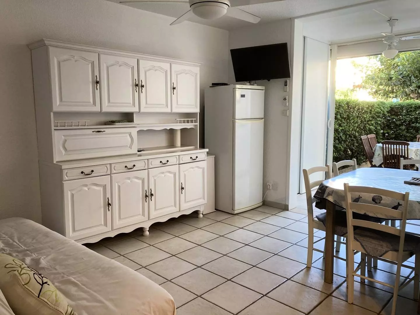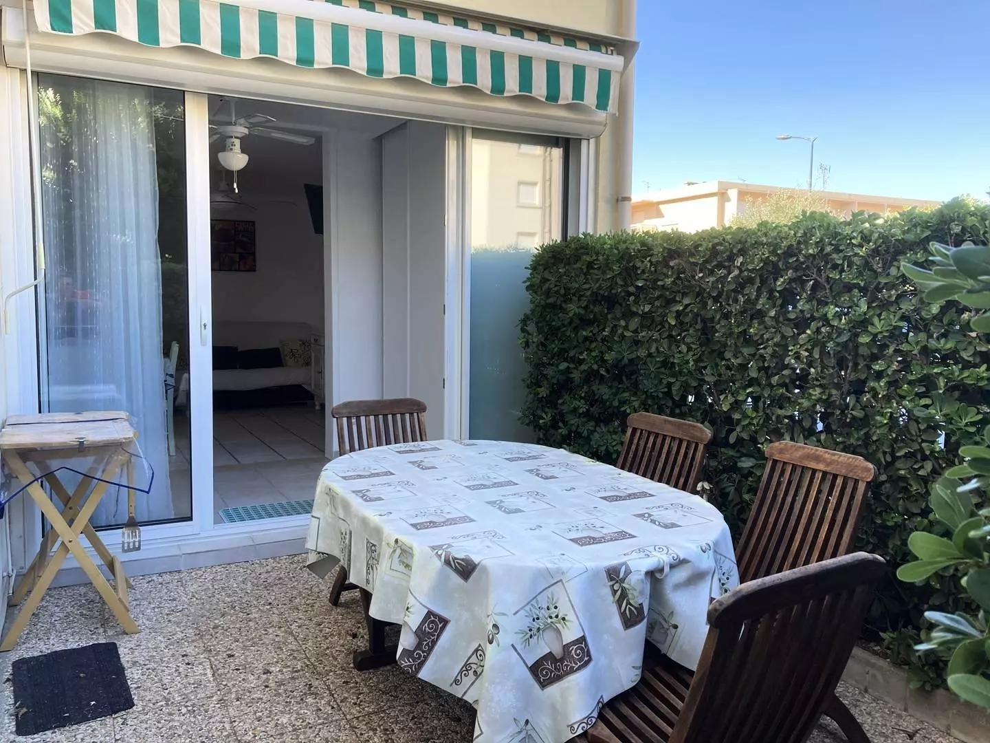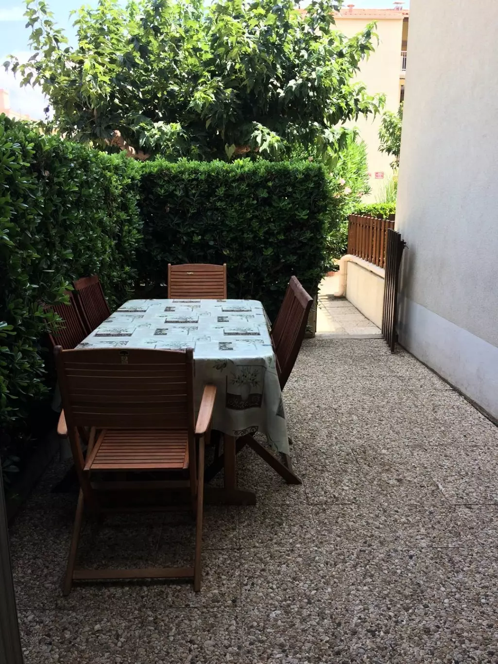It also has an exterior with a fenced garden (table and chairs, electric awning).