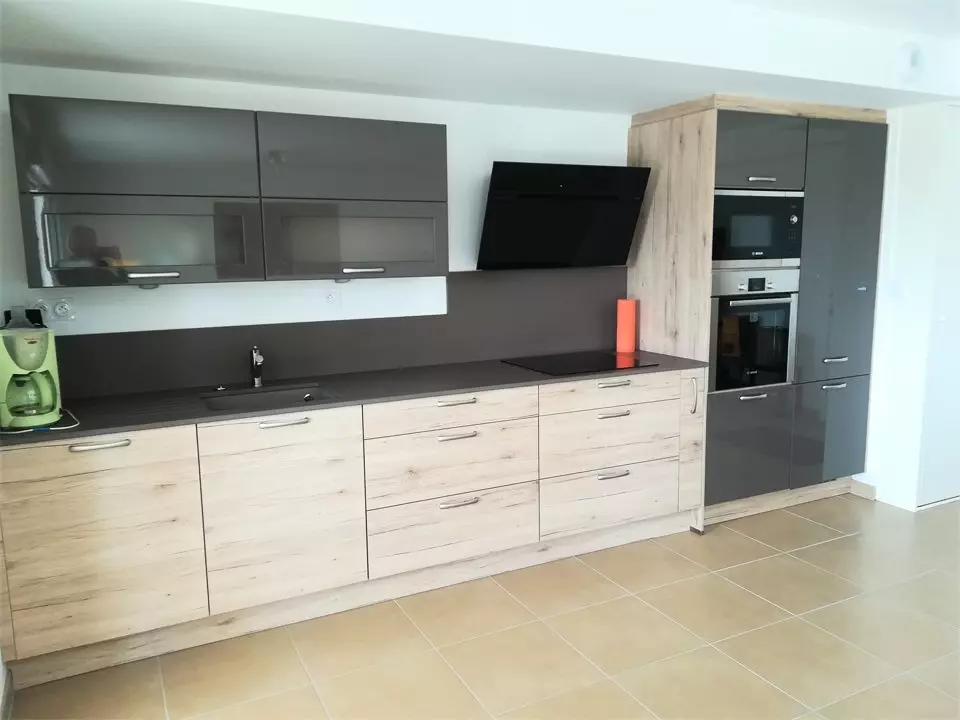 -An open kitchen equipped and fitted, with microwave, induction hob, oven, refrigerator with freezer section, sink, extractor hood, toaster, coffee maker, dishwasher;