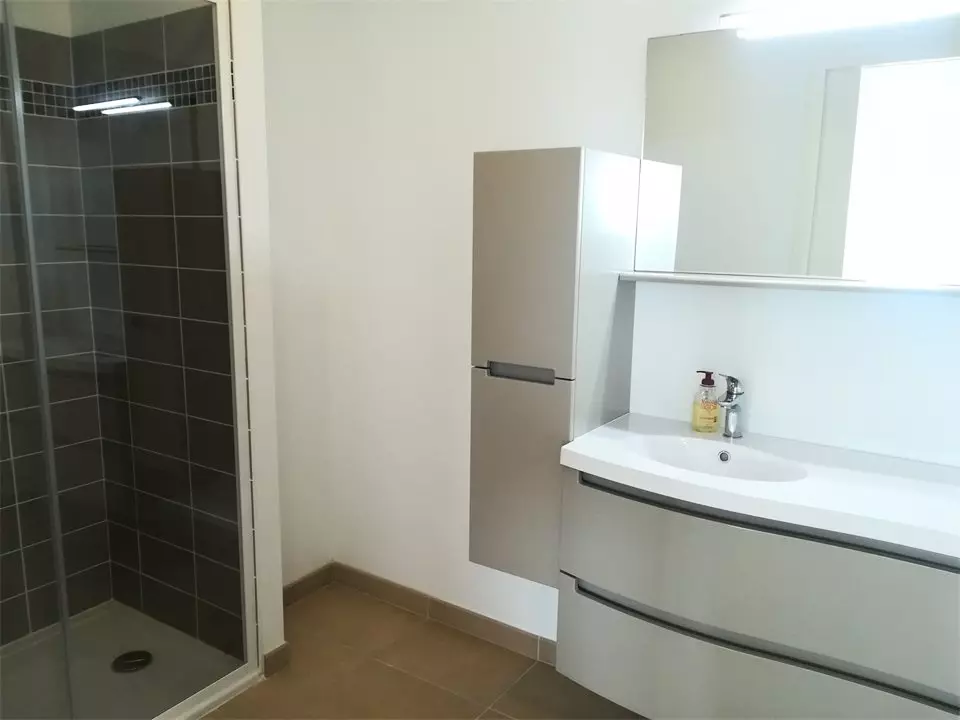 -A bathroom with shower, sink, washing machine, towel dryer;
