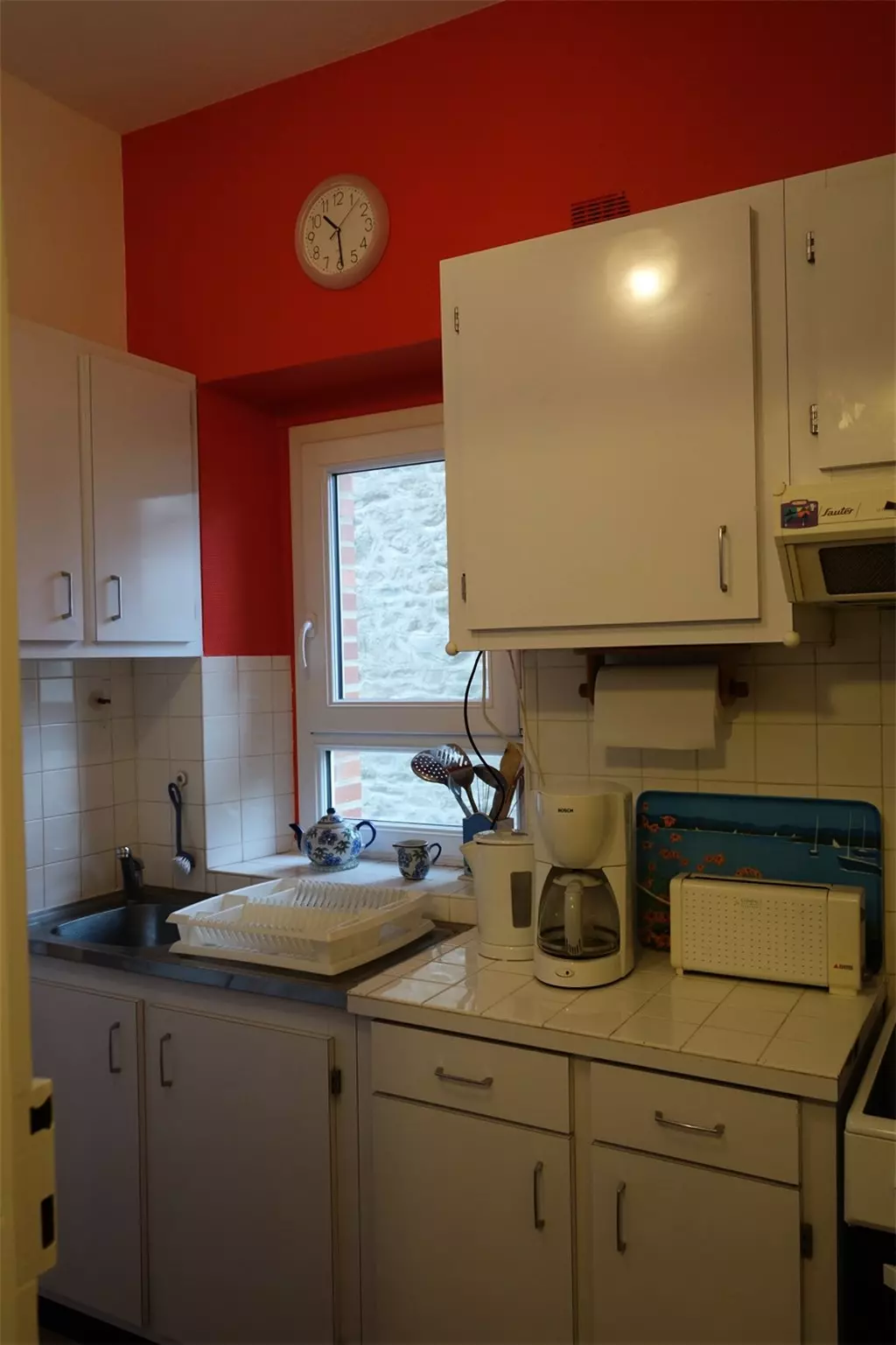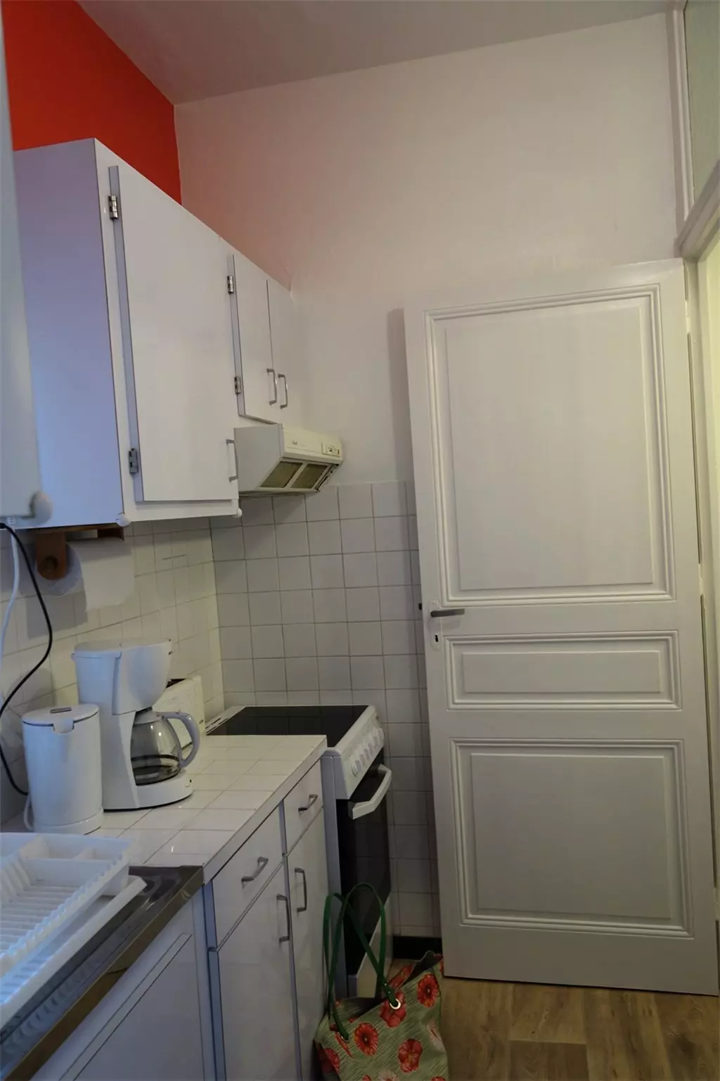 -A kitchen equipped with extractor hood, ceramic hob, electric oven, refrigerator, sink, kettle, toaster, coffee maker;