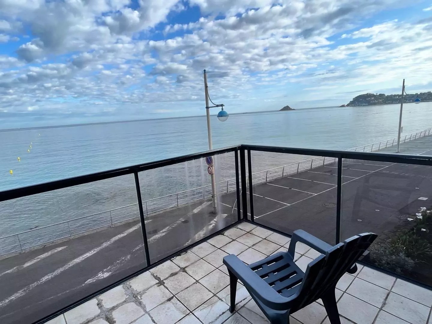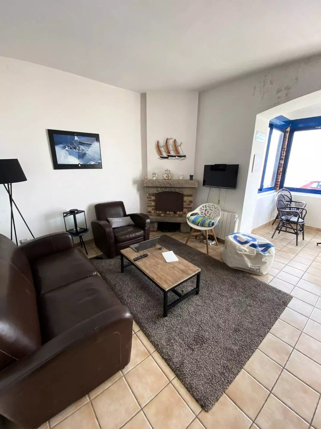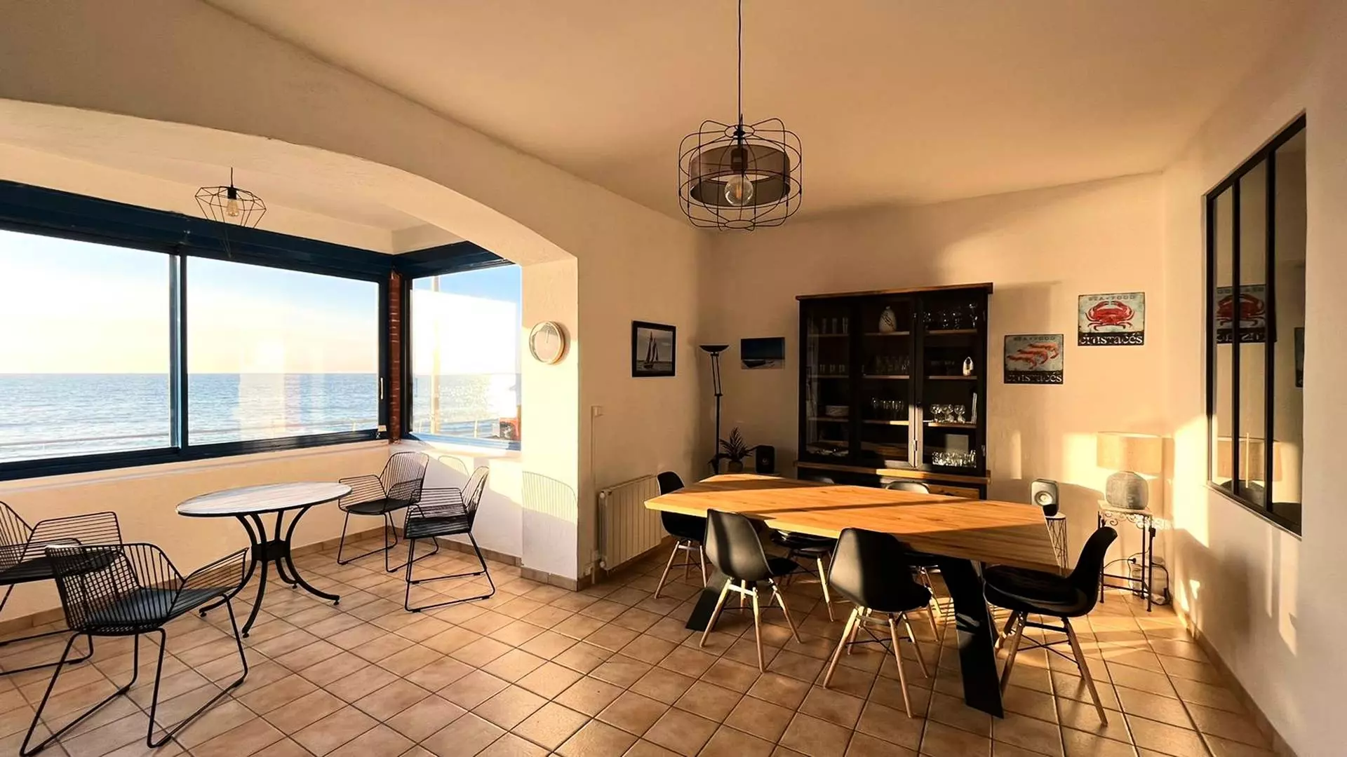 - A living room with sofa and armchair, TV, dining table for 8 people, bay windows with balcony overlooking the seawall;