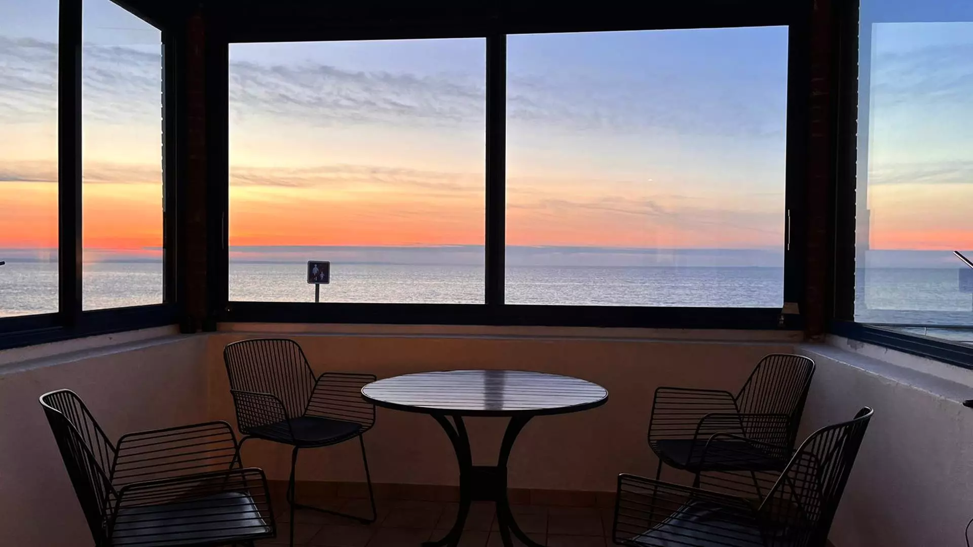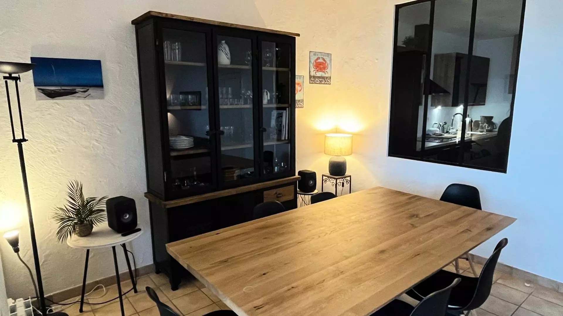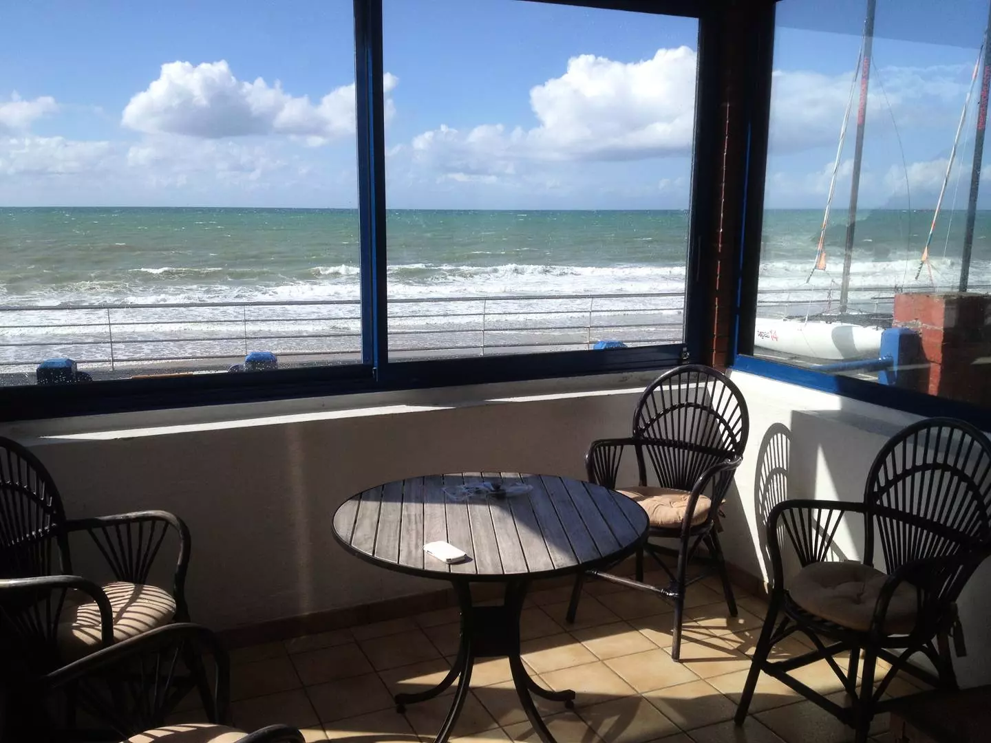 - A living room with sofa and armchair, TV, dining table for 8 people, bay windows with balcony overlooking the seawall;