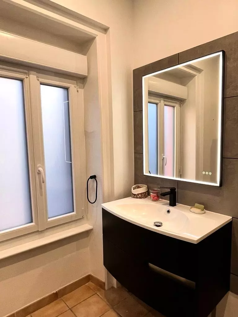 - Bathroom with shower, sink, towel dryer and washing machine,