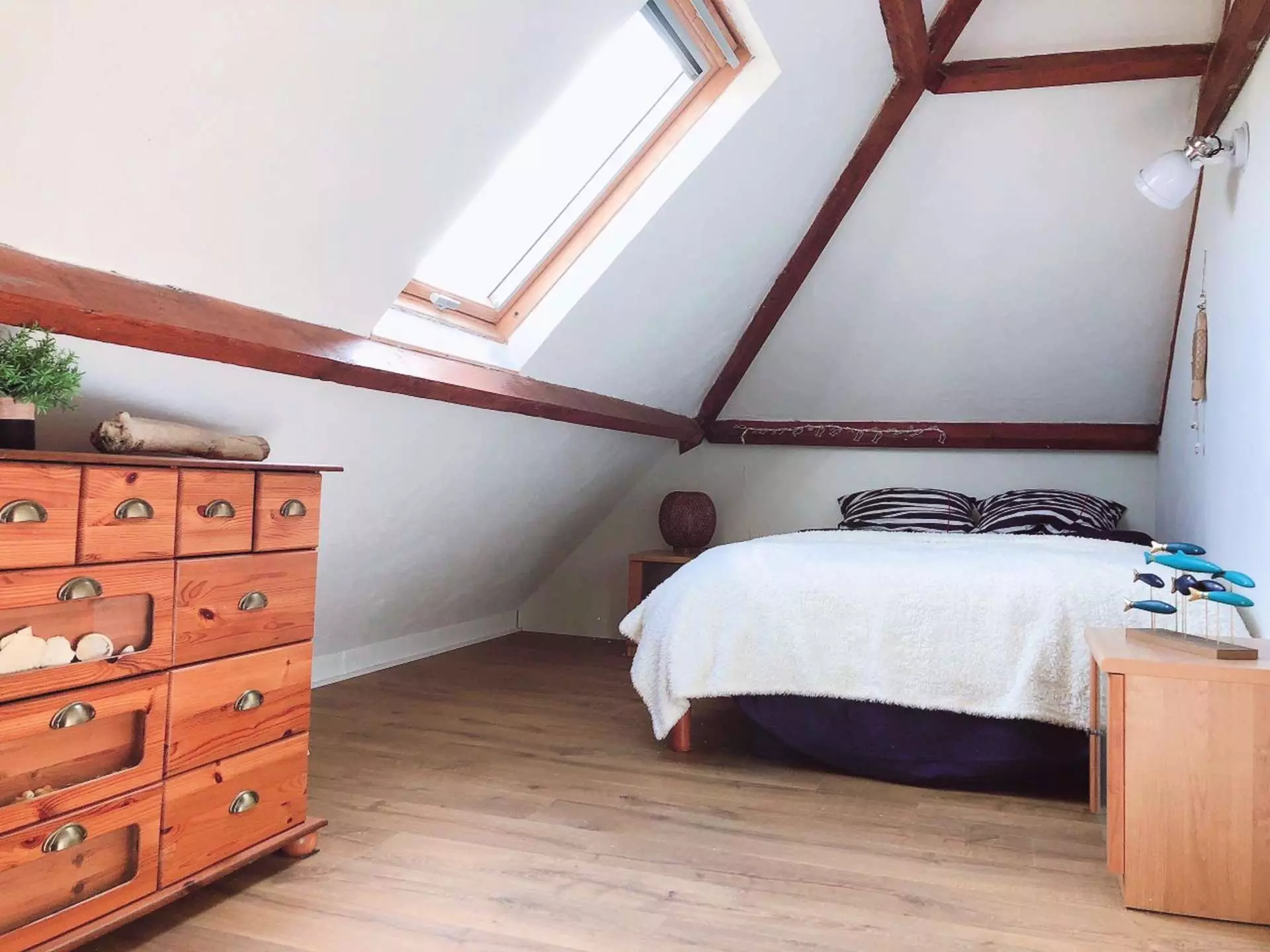 In Landrellec, Ker C'hregen (with shells) is a 3*** holiday home for 6 people for a seaside stay. With a surface area of 80 m², it consists of an entrance hall leading to a living room/TV lounge, high-speed Wi-Fi connection, a separate kitchen, a dining room with terrace access, a bedroom and a bathroom with WC on the ground floor. Upstairs: two bedrooms, a workspace, a shower room with WC. Magnificent, fully private, wooded garden, private parking. Pets not allowed. Final cleaning included. Linen optional.