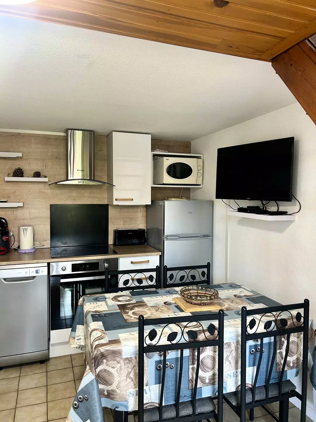 A fully equipped kitchen, washing machine, oven, ceramic hob, microwave, fridge-freezer.