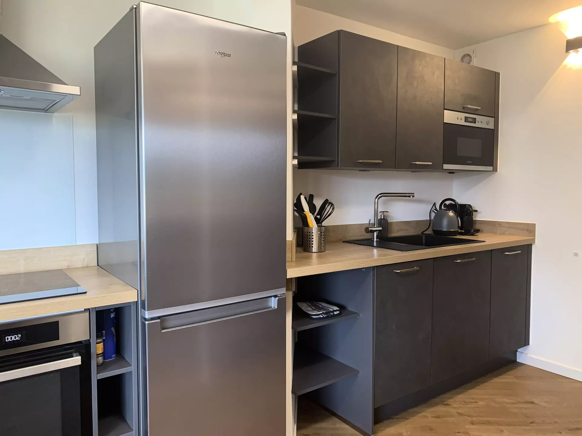 * American kitchen: oven, microwave, fridge/freezer, 4-burner induction hob, Nespresso coffee machine, kettle, toaster;