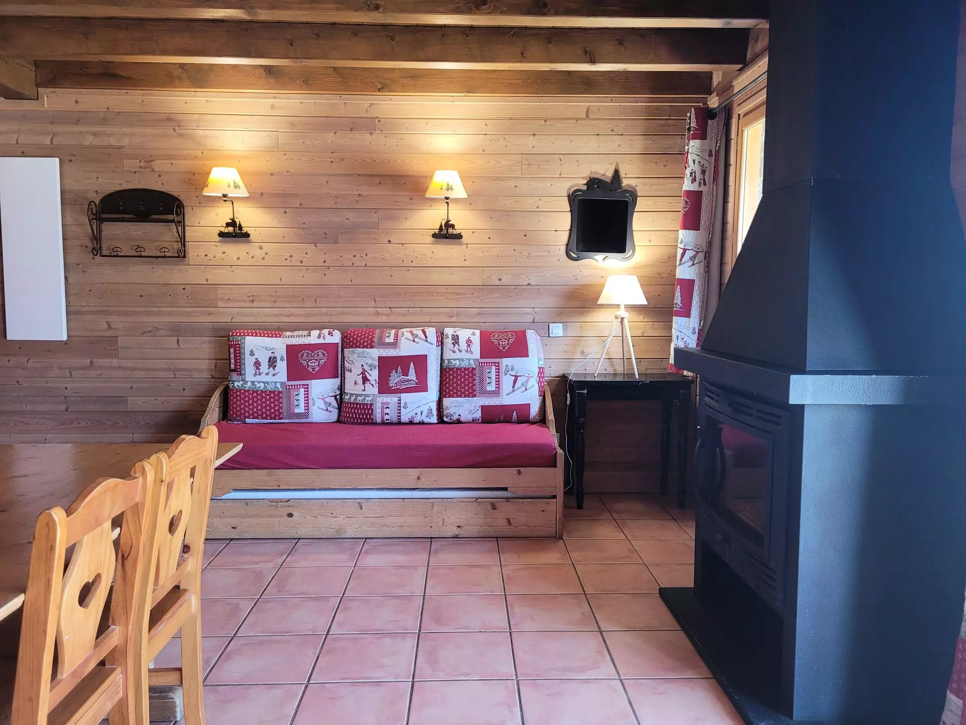 * Living room with pull-out sofa for 2 people, blankets, HD TV, fireplace insert, beautiful wooden furniture, terrace access.