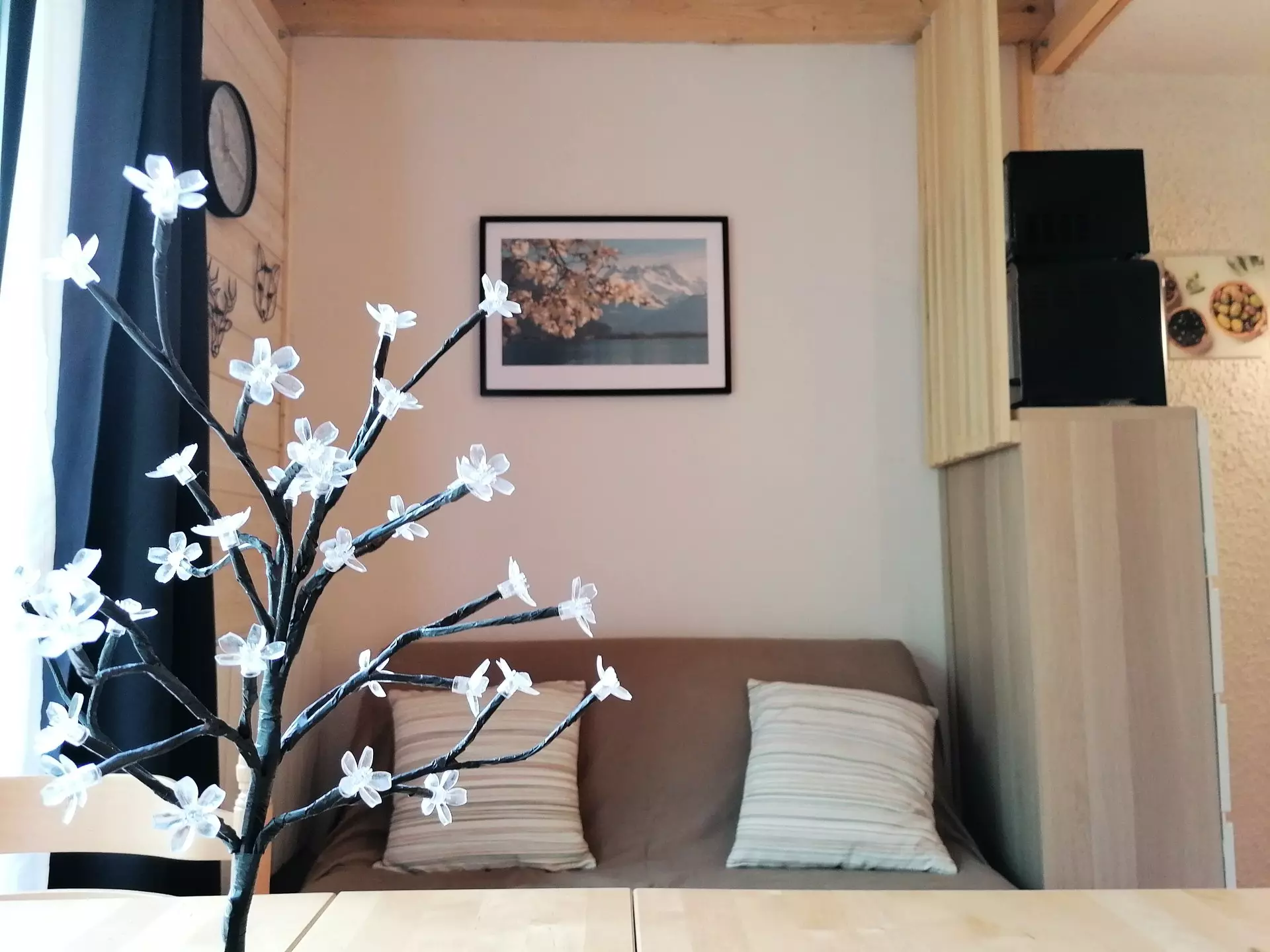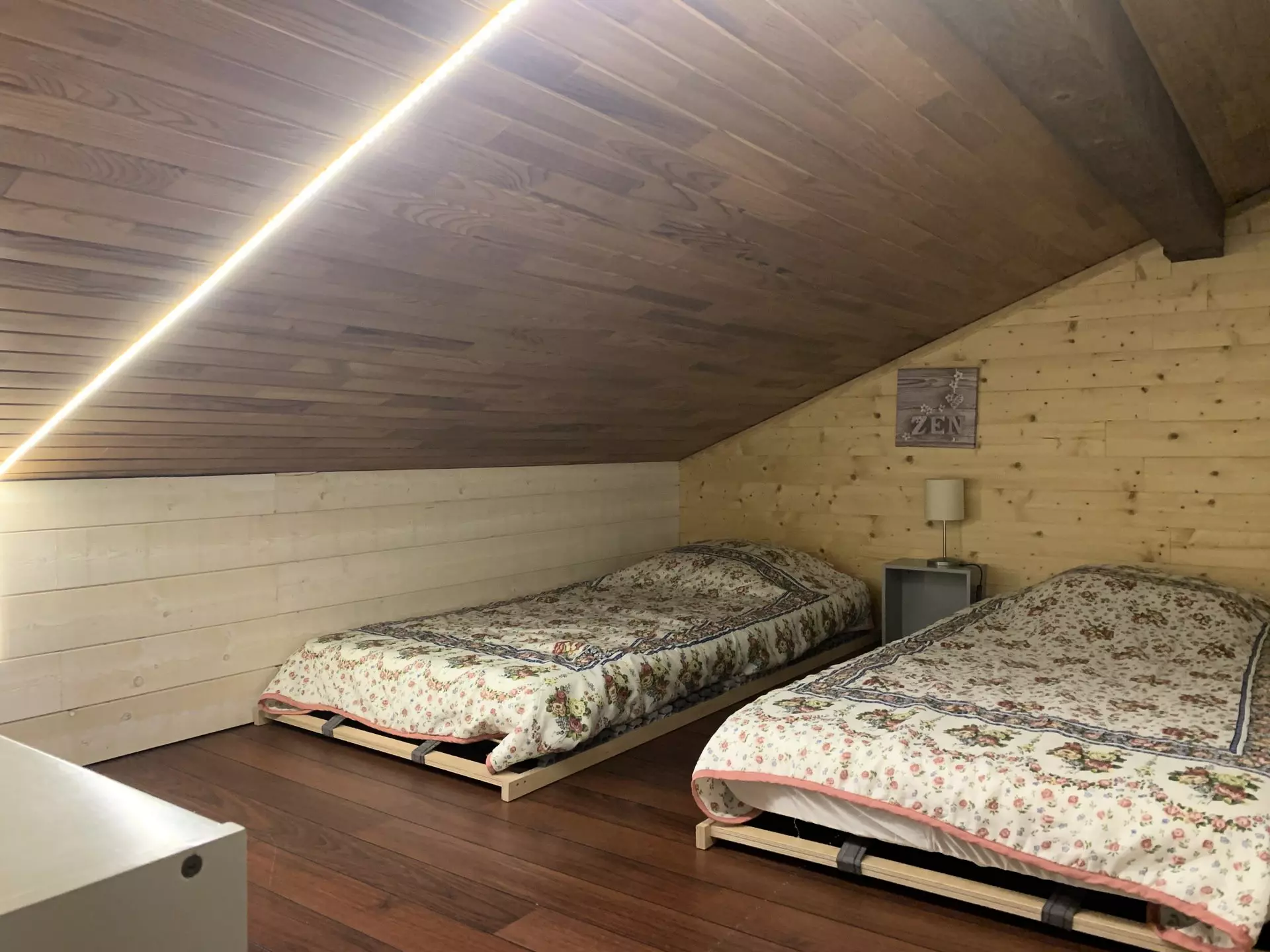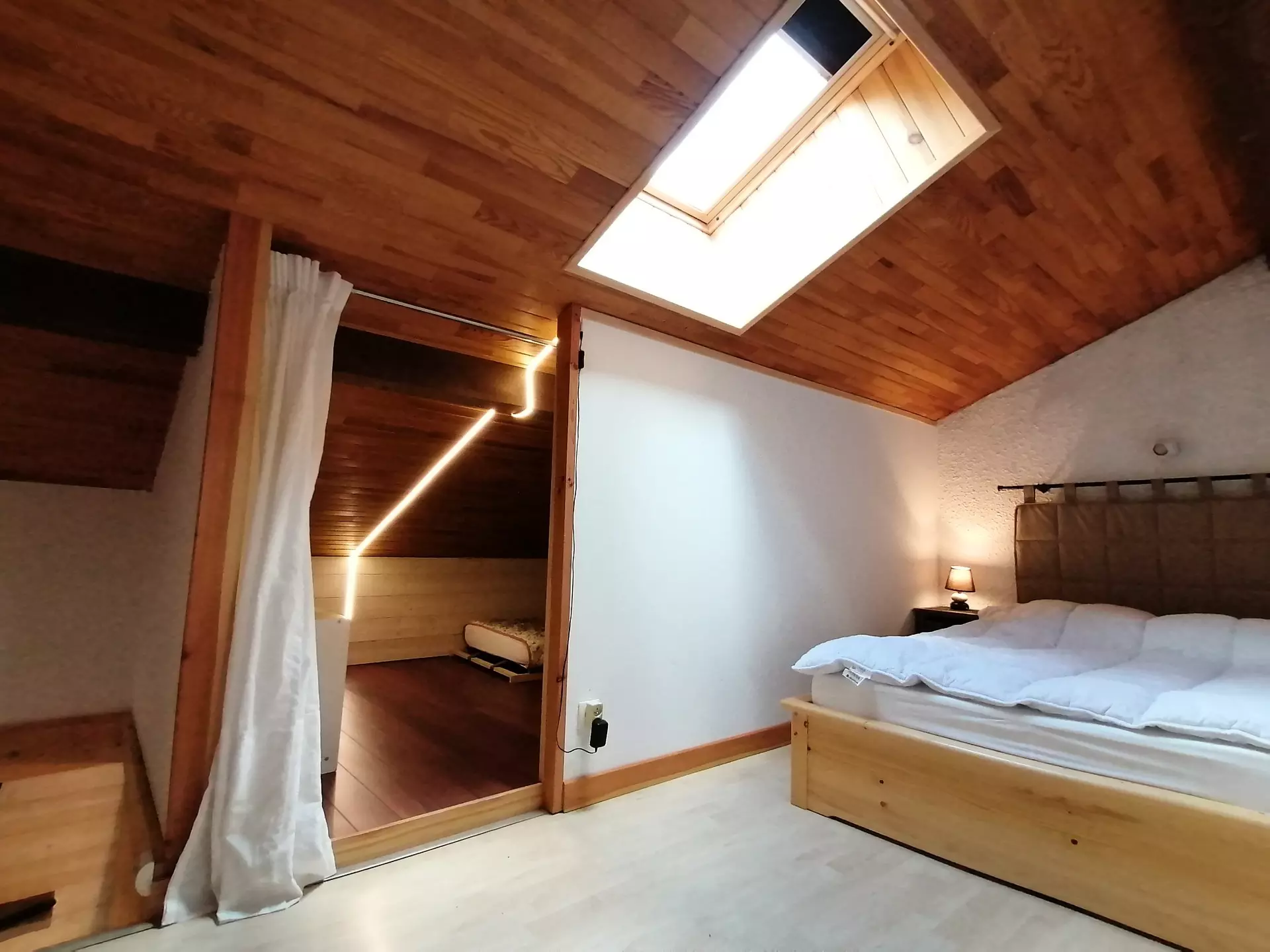 * Mountain corner closed by curtain: 2 single beds, storage, skylight;