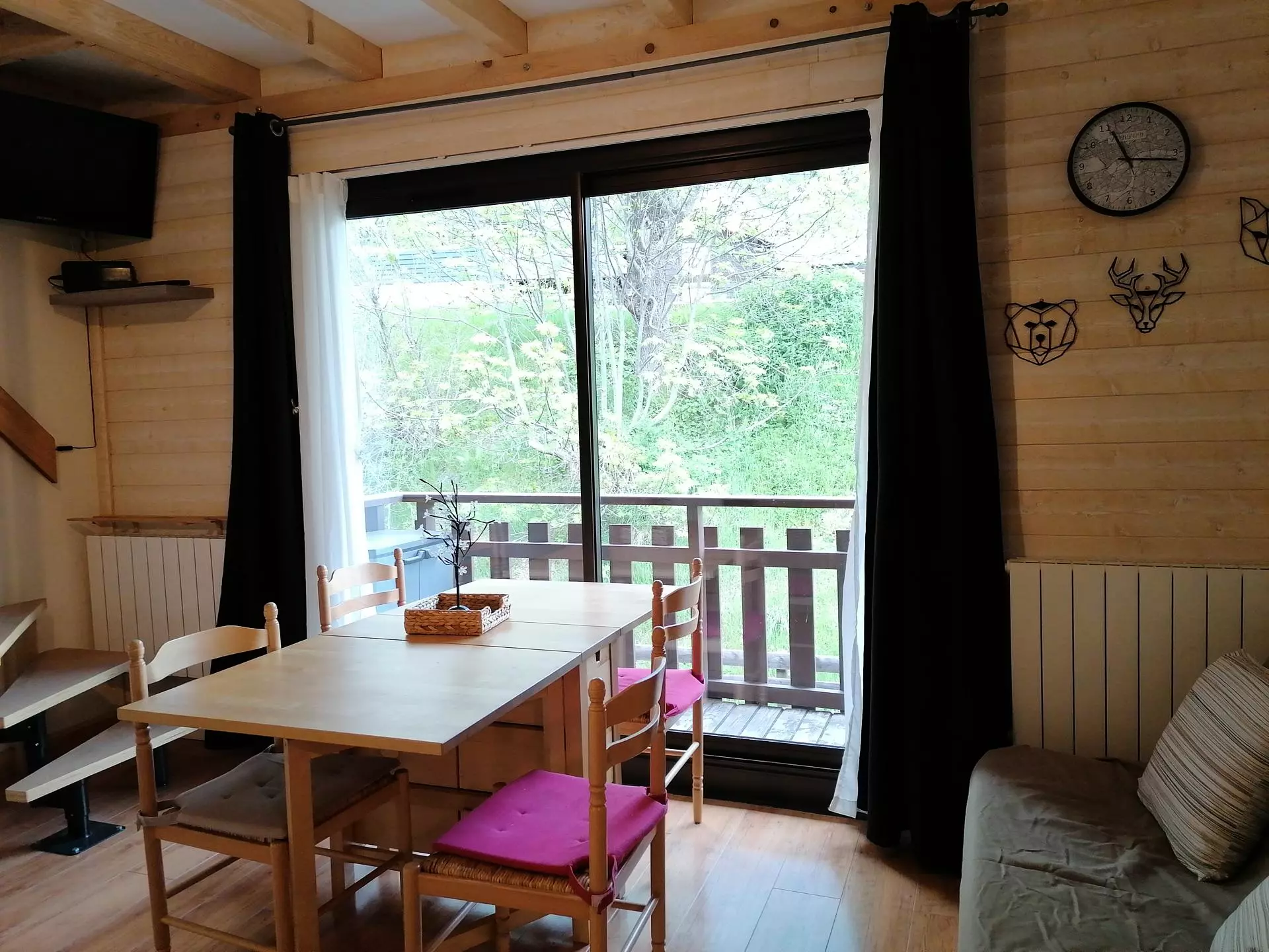 * Living room / Dining area: 2-seater BZ sofa bed, HD television, balcony access;