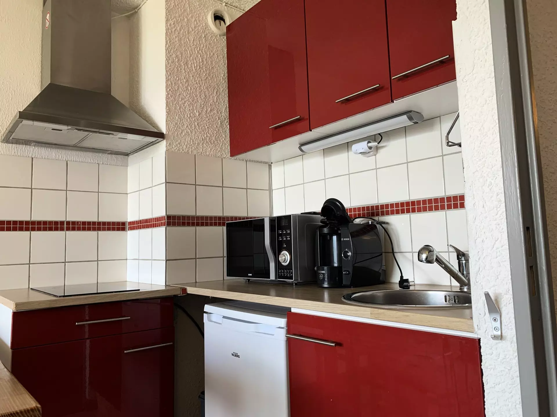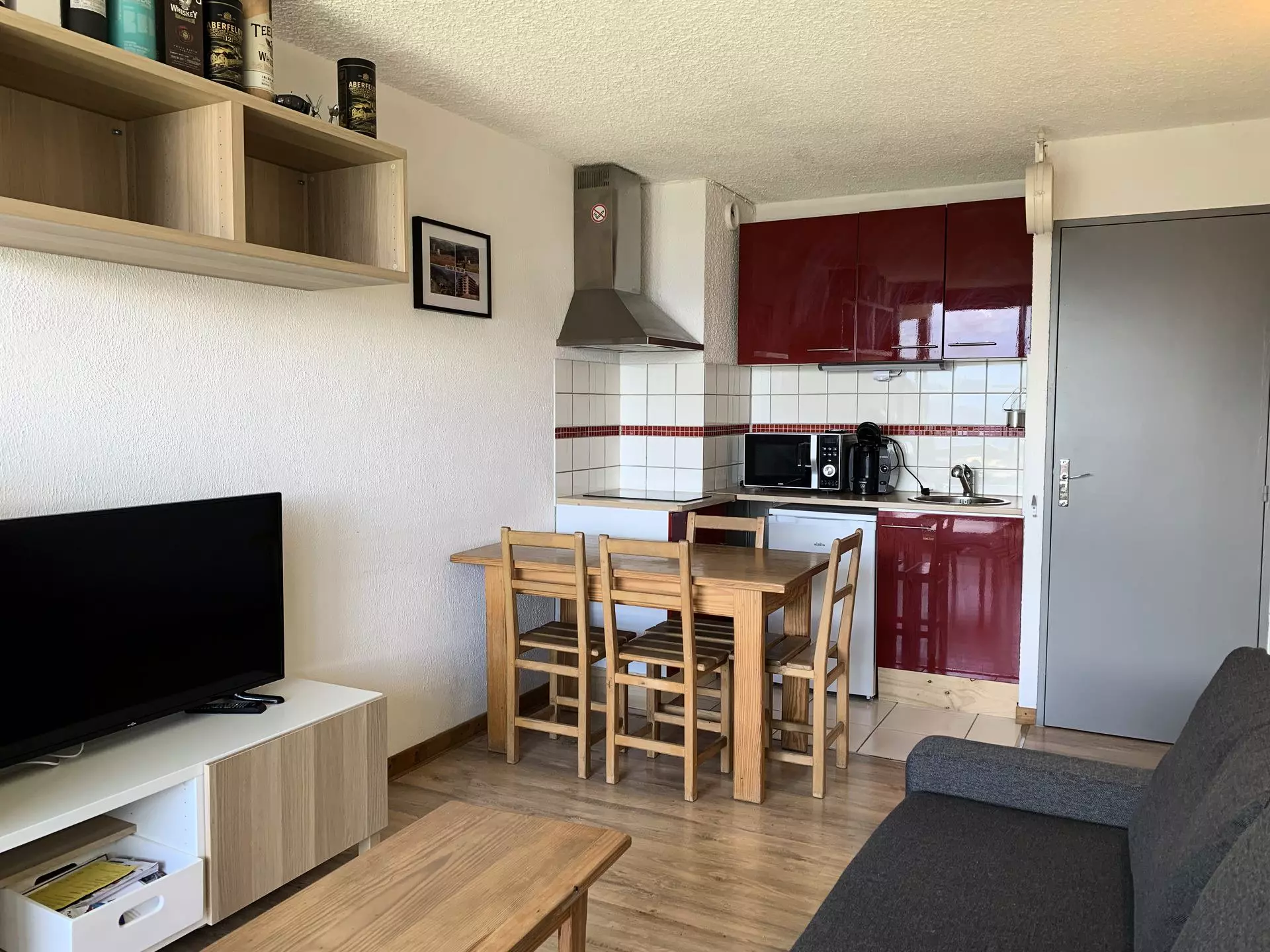 * Kitchen area: Refrigerator, 2 ceramic hobs, microwave grill, Tassimo coffee maker, kettle, toaster, raclette machine, fondue set, grill;