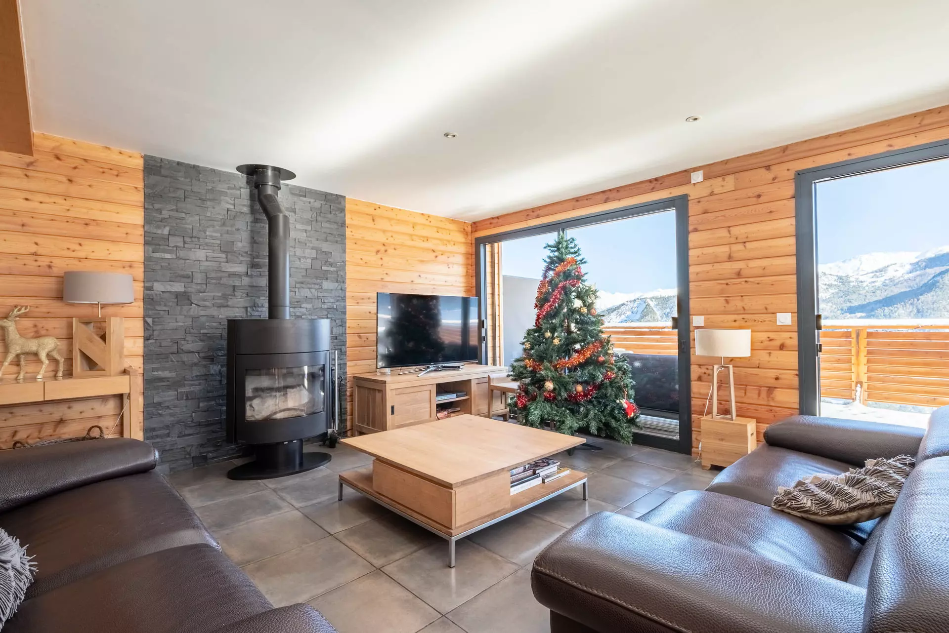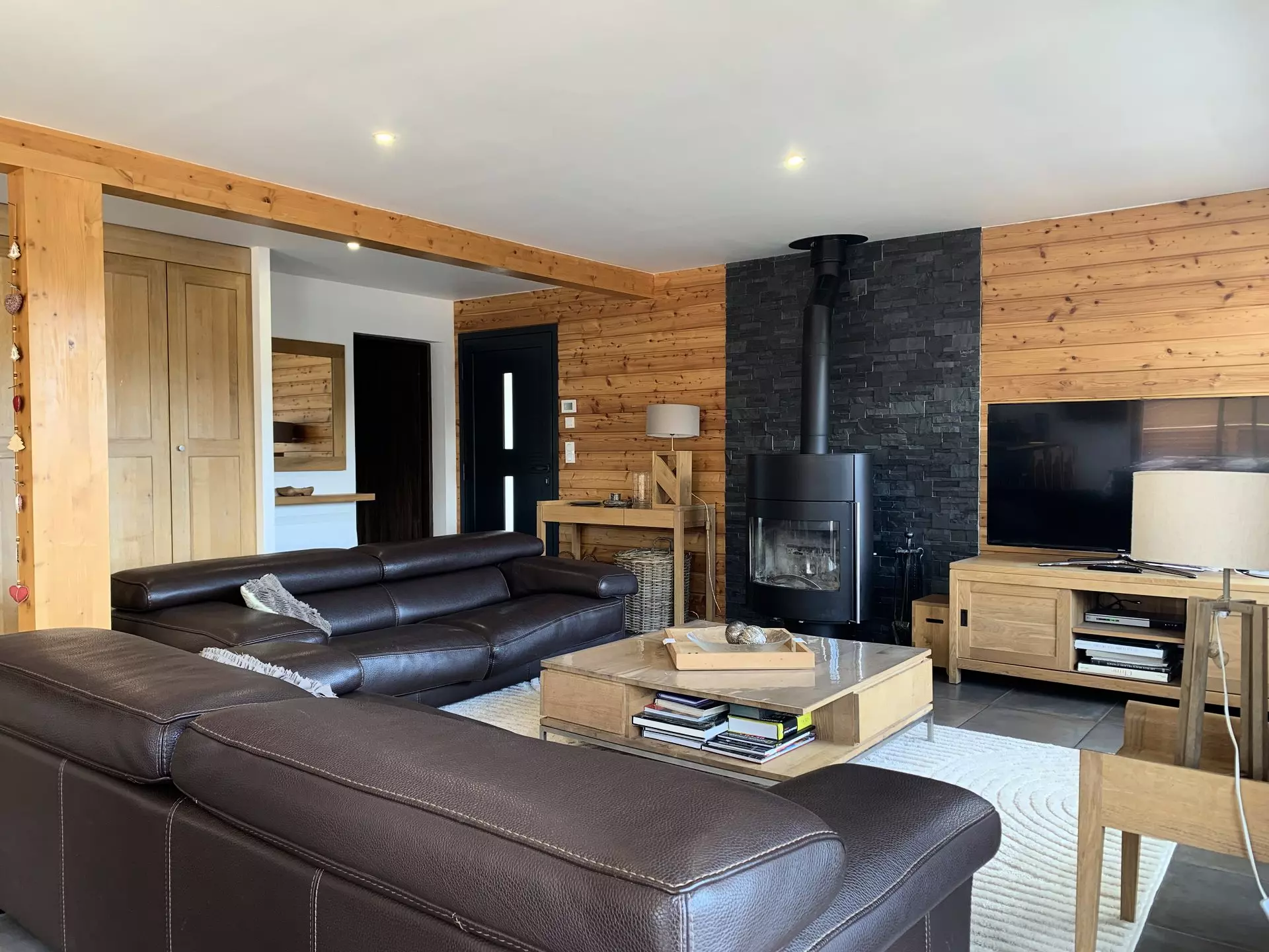 * Spacious living room: HD TV, wood stove, leather sofas, coffee table, access to terrace - solarium;