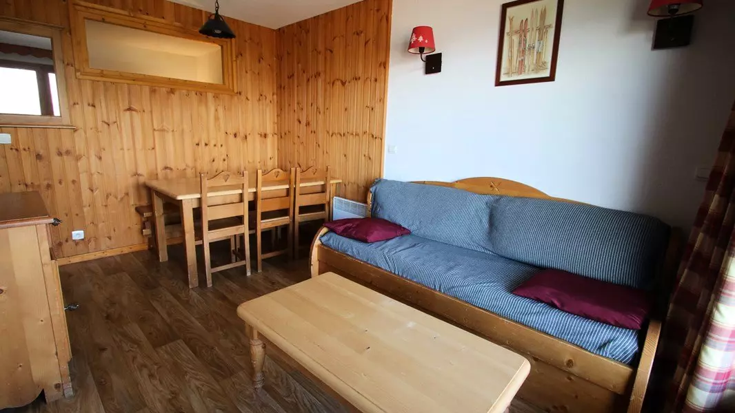 - Living room with convertible sofa bed (2/80x190 or 1/160x190), dining table, flat screen TV and balcony equipped with a table and two chairs.