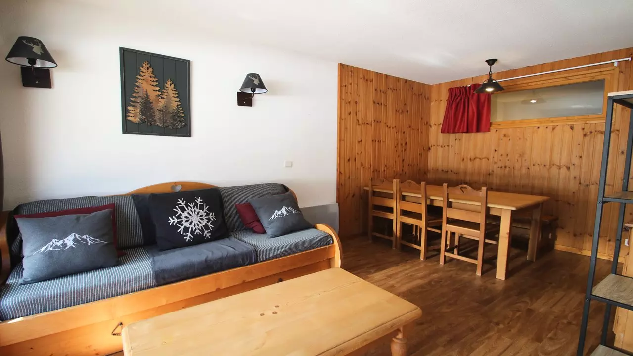 - Living room with convertible sofa bed (2/80x190 or 160x190), dining table, flat screen TV and balcony equipped with a table and two chairs.