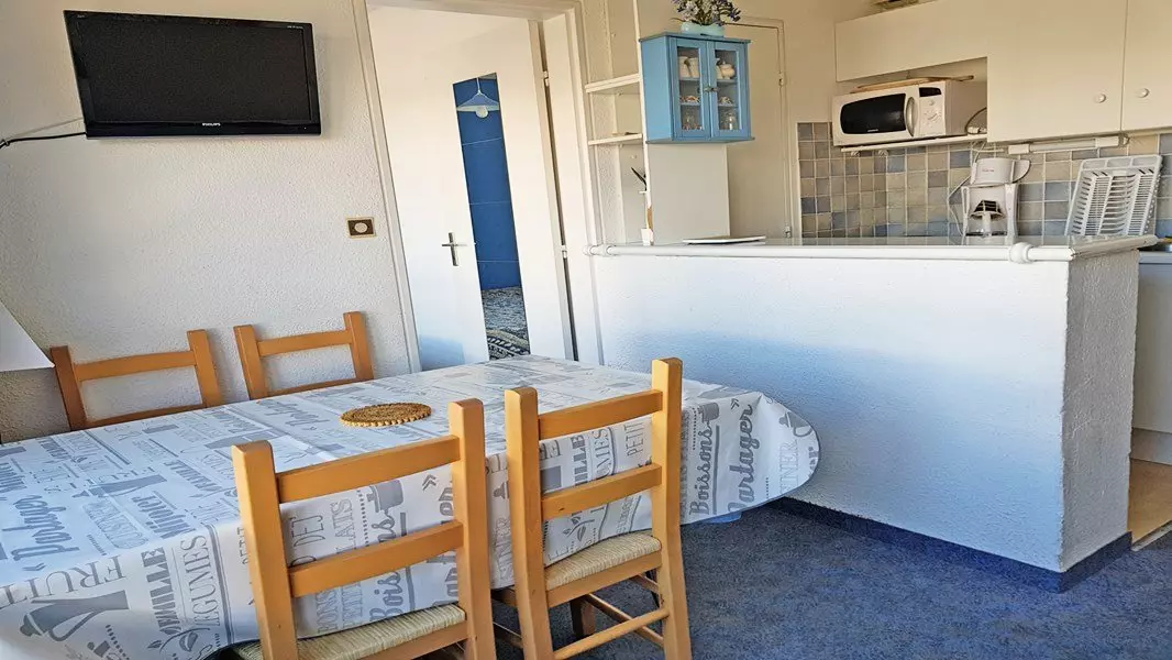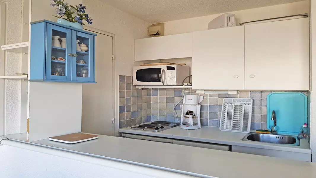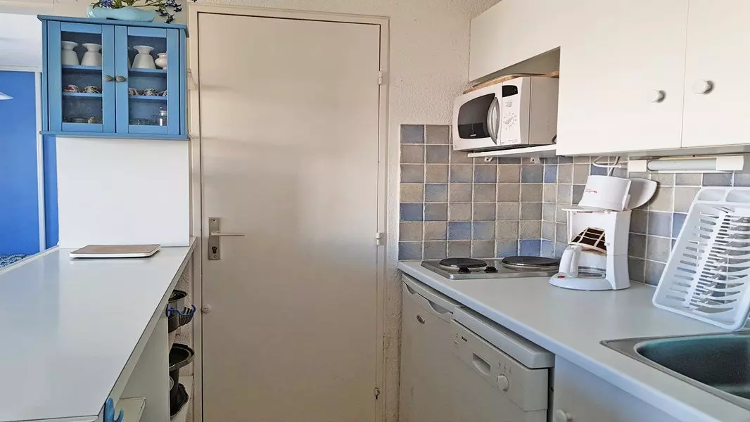 Equipped kitchenette: 2-burner electric hob, microwave, dishwasher, filter coffee maker and toaster