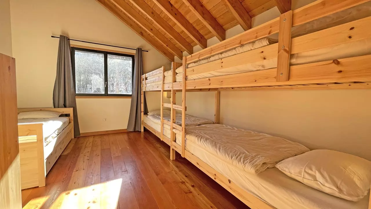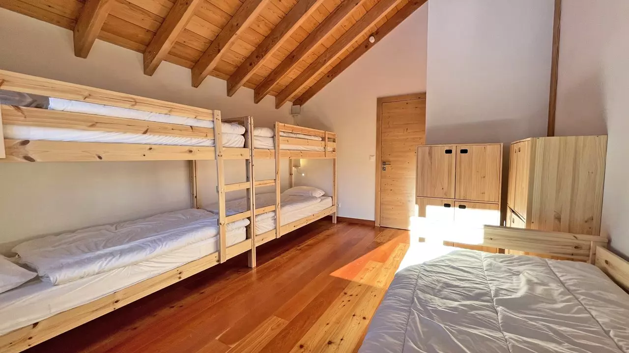 Upstairs: 2 bedrooms with 160cm double bed, a bathroom with bathtub, separate toilet, a dormitory with 6 beds (bunk beds and a trundle bed), a bathroom with walk-in shower.