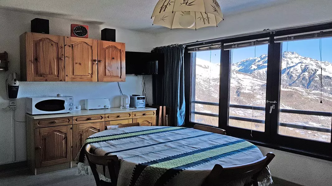 - Main room, with kitchenette and dining area, living room equipped with a sofa bed, flat screen TV and mini-stereo