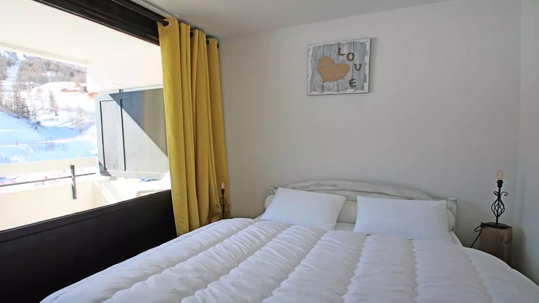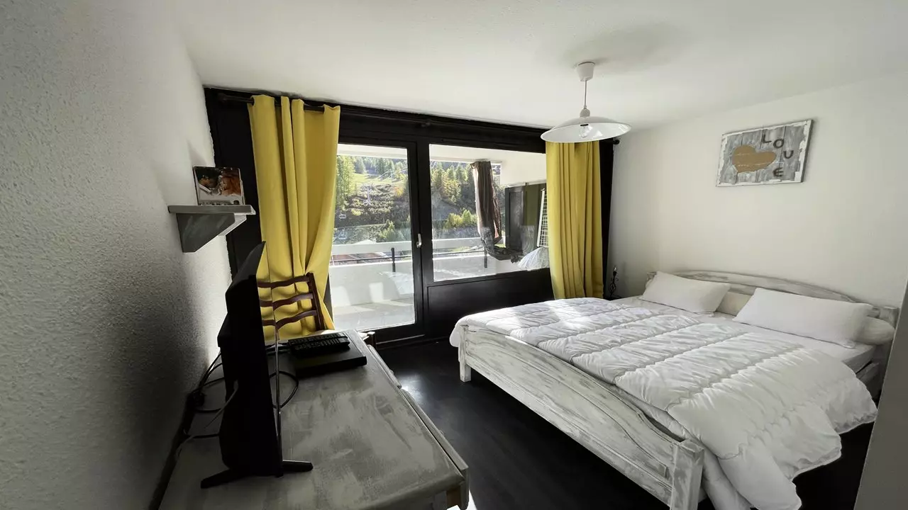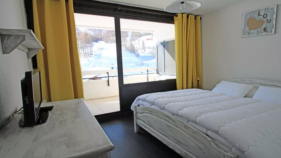- Bedroom with double bed (140 cm), closet and chest of drawers, flat screen TV with access to the terrace
