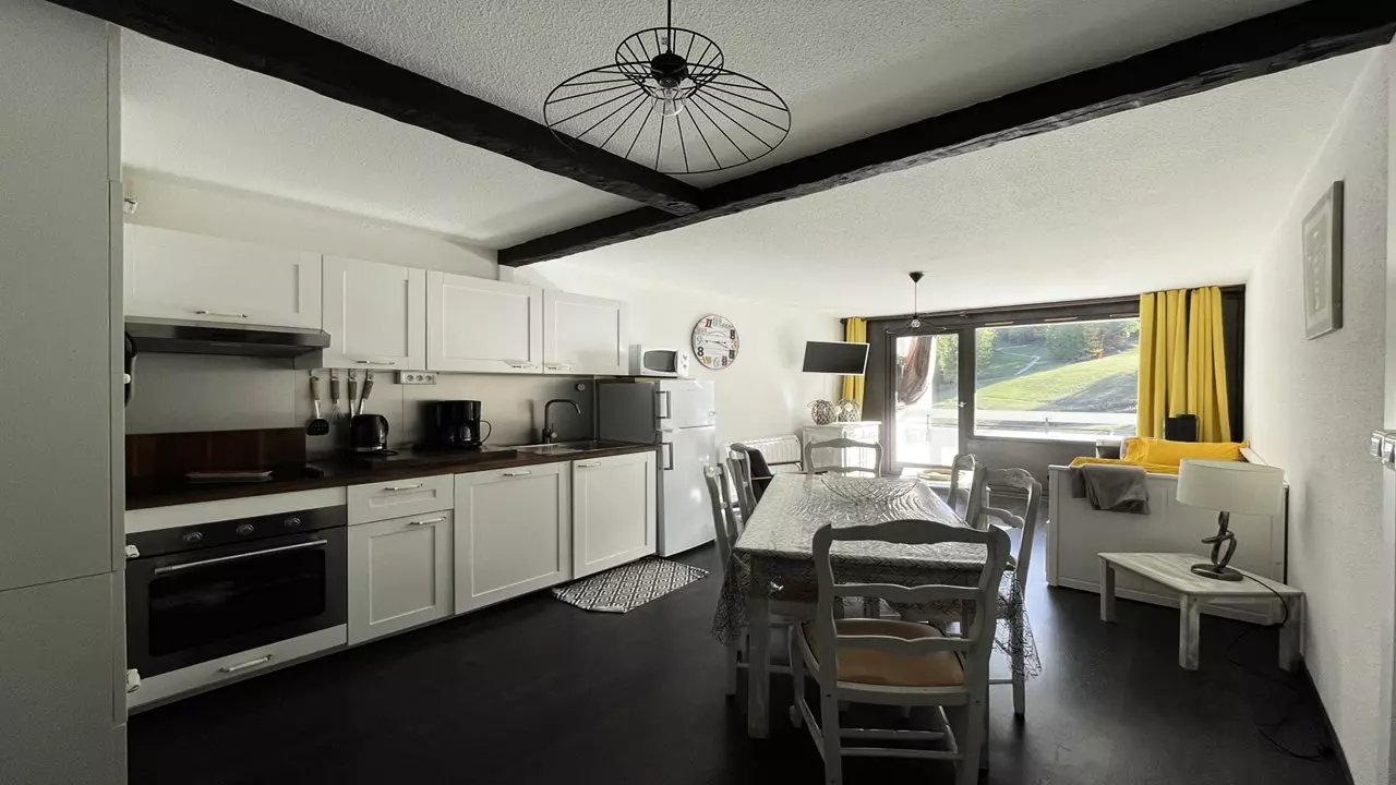 - Spacious and bright living room, equipped with a dining area, 160cm sofa bed, flat screen TV and DVD player with access to the terrace