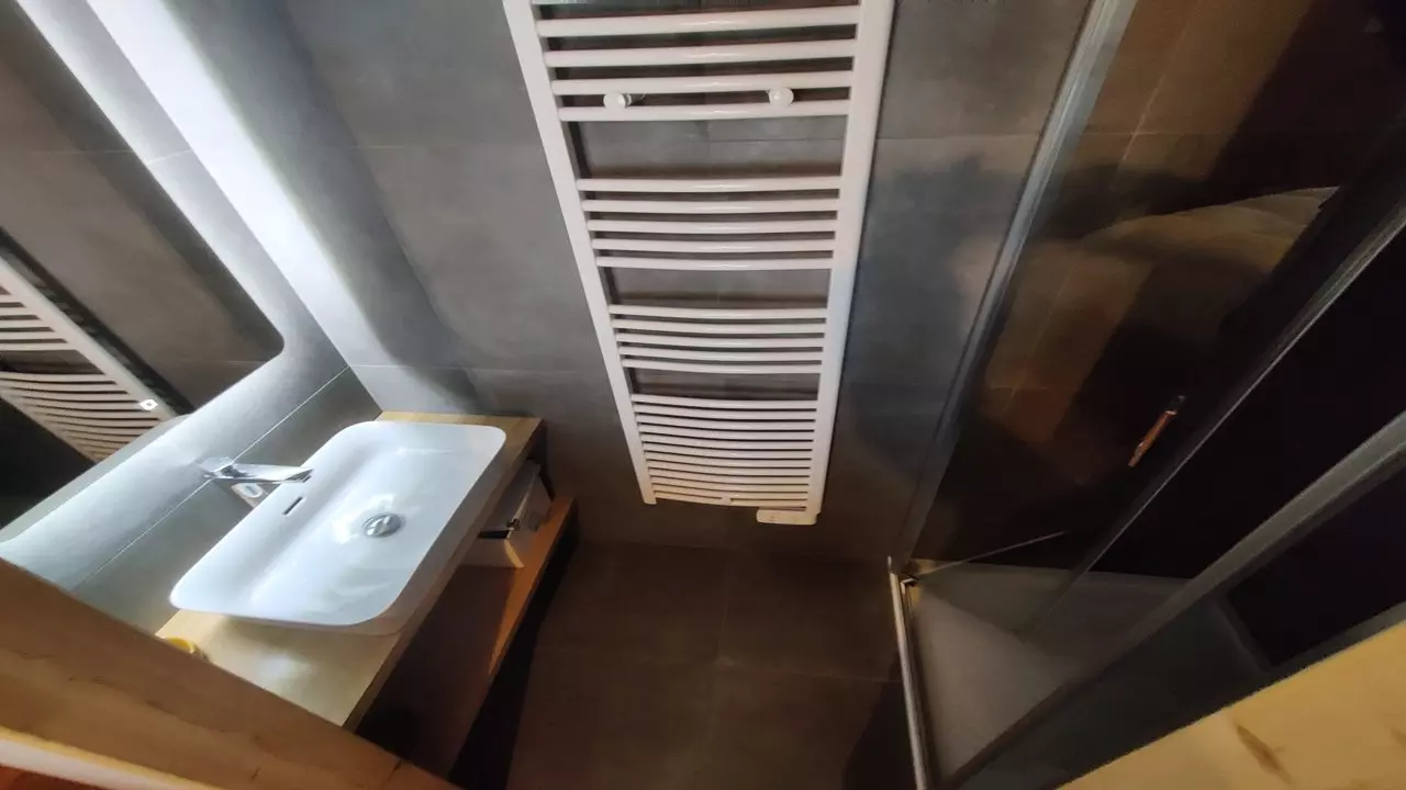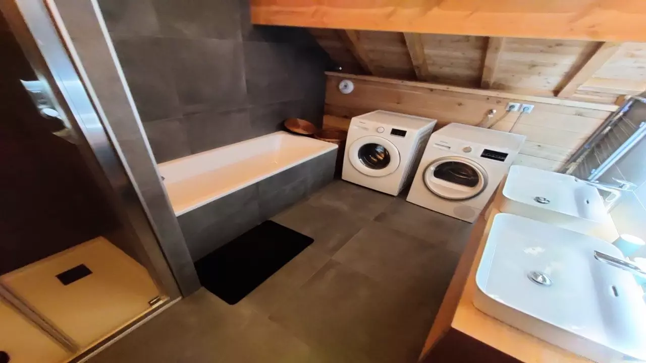 Upstairs: 1 double bedroom with 160cm bed, a bathroom with bathtub and walk-in shower, a washing machine and dryer are available.