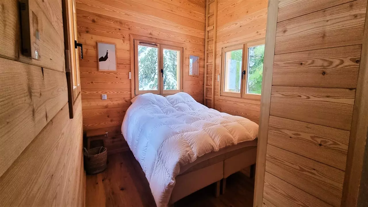 On the ground floor: Entrance with cupboards, a separate toilet, a bathroom with shower and vanity unit, a double bedroom (160 cm bed) and a mezzanine accessed by ladder, composed of 2 single beds.