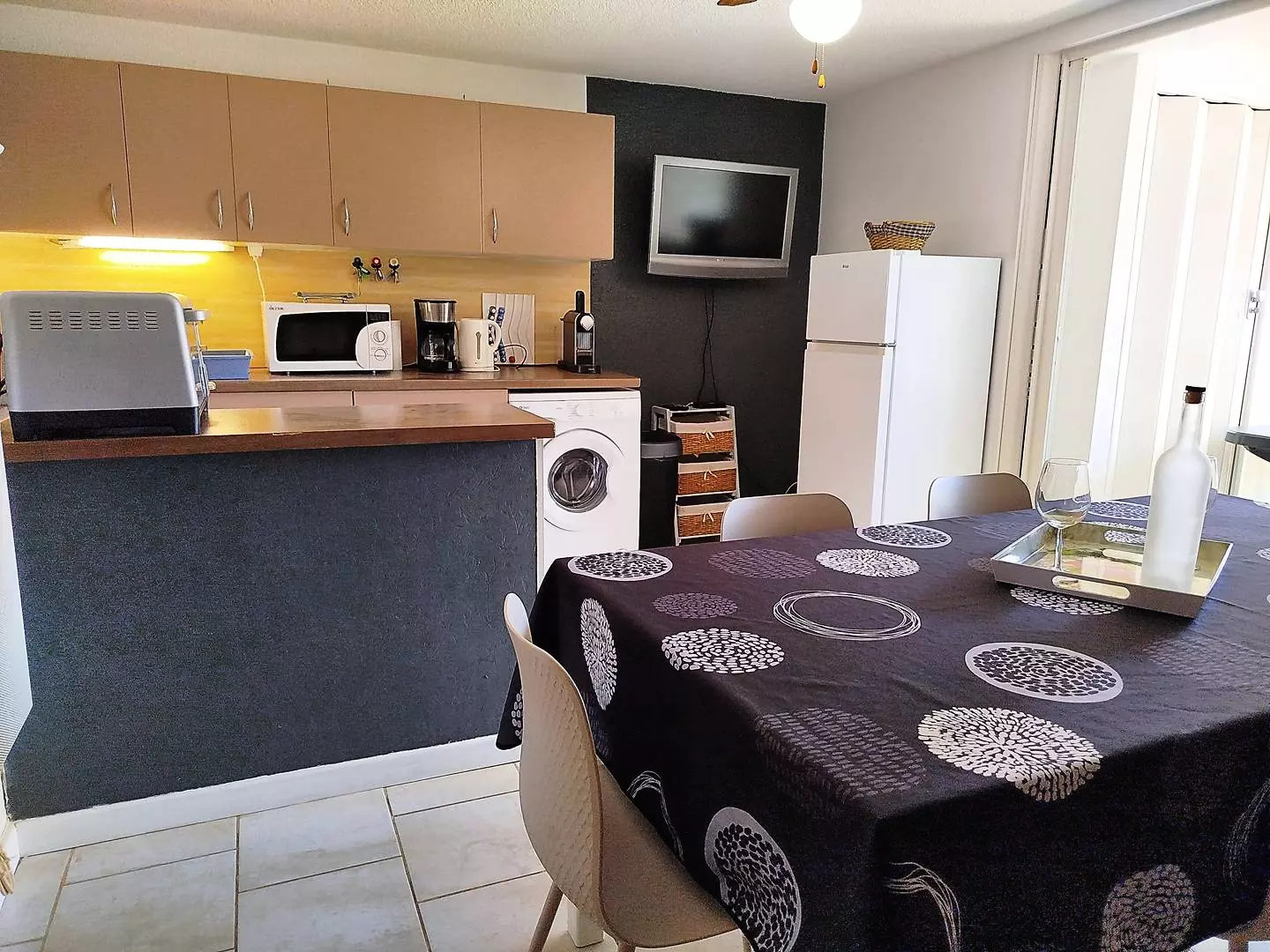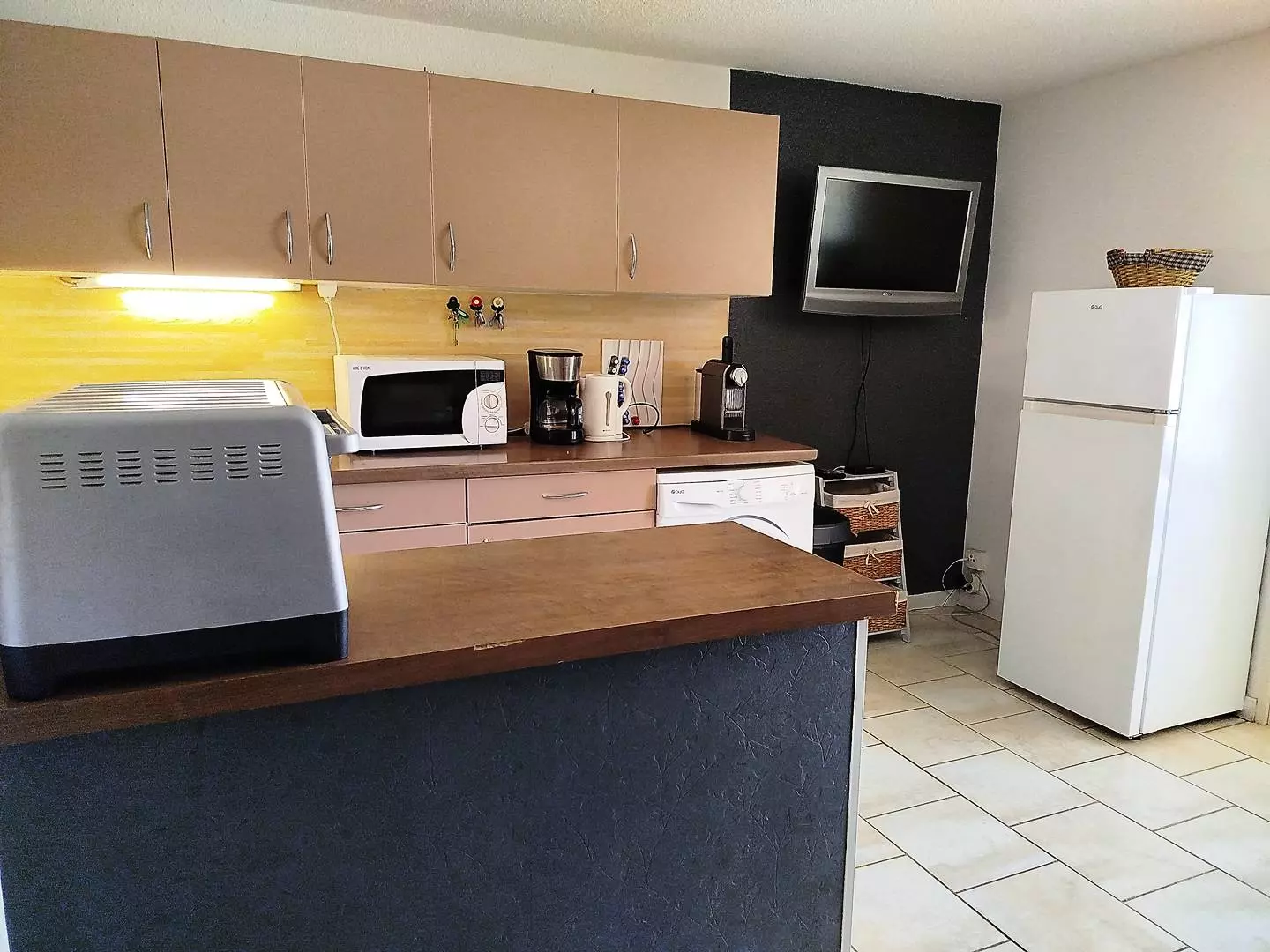 An entrance hall, a living room with fitted kitchen (fridge/freezer, washing machine, dishwasher, oven, microwave, 4-burner electric hob, etc.)