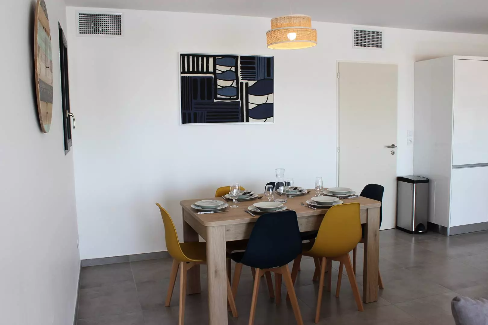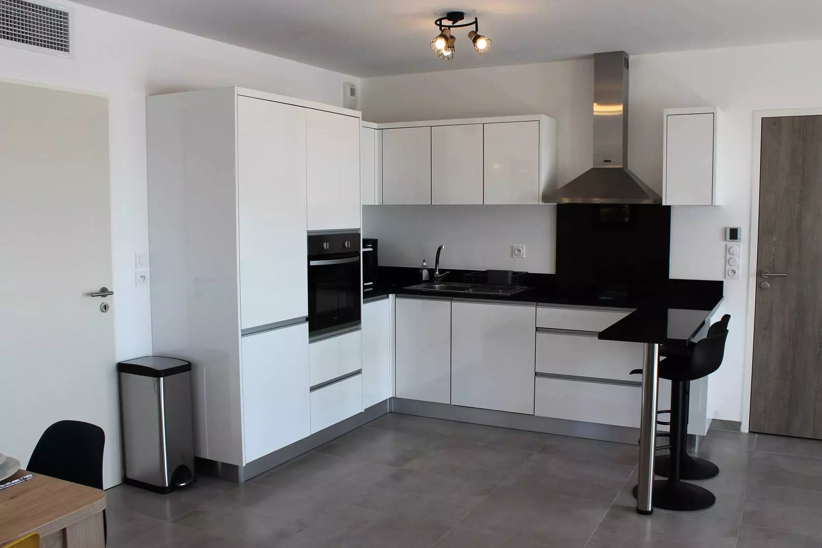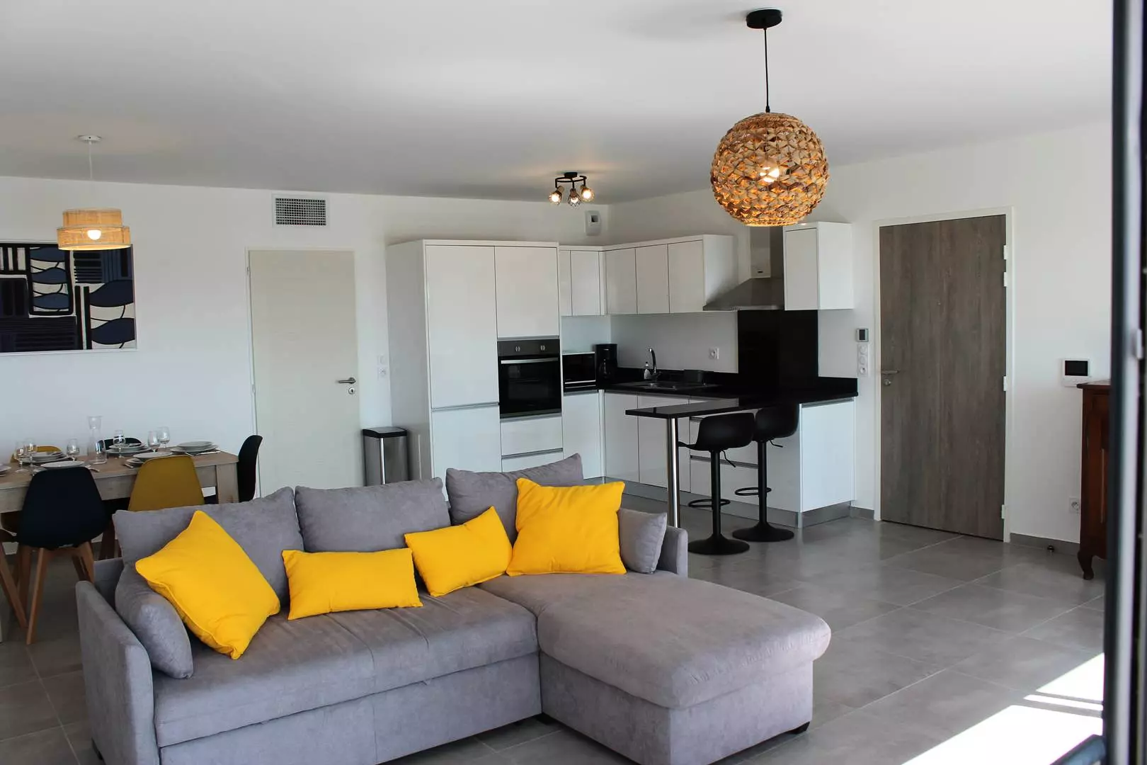 The apartment on the 2nd floor, designed as a crossing, consists of a bright living room with a fully equipped kitchen area: dishwasher, induction hob, fridge freezer, multifunction oven, microwave... all opening onto a beautiful and large terrace of 18m2.