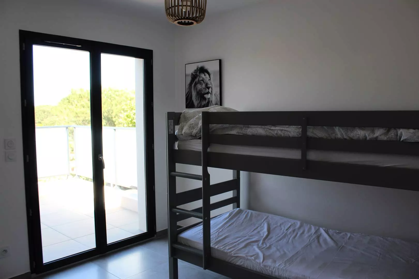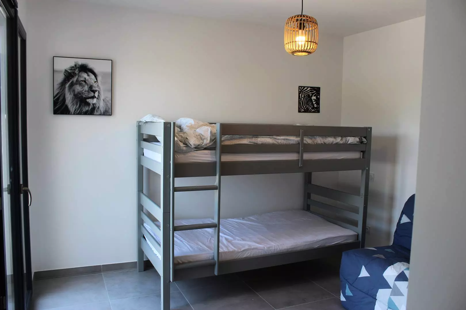 A hallway leads to two bedrooms: bedroom 1 with a 140cm bed and bedroom 2 with a 90cm bunk bed and a sofa bed. Both bedrooms open onto a shared terrace. Each has a television.