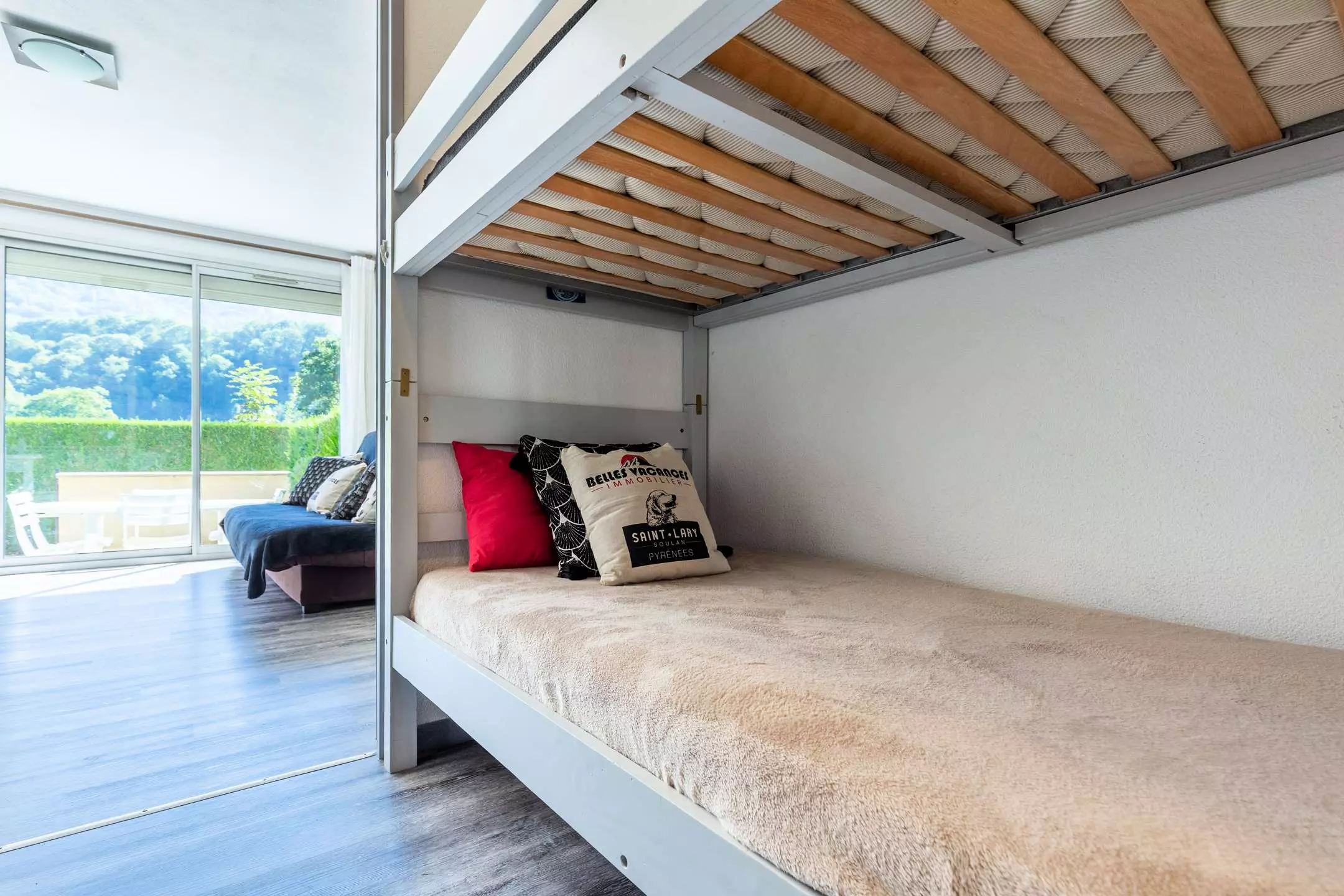one bedroom with 1 double bed (140/190) and a sleeping area with 2 bunk beds (90/190)