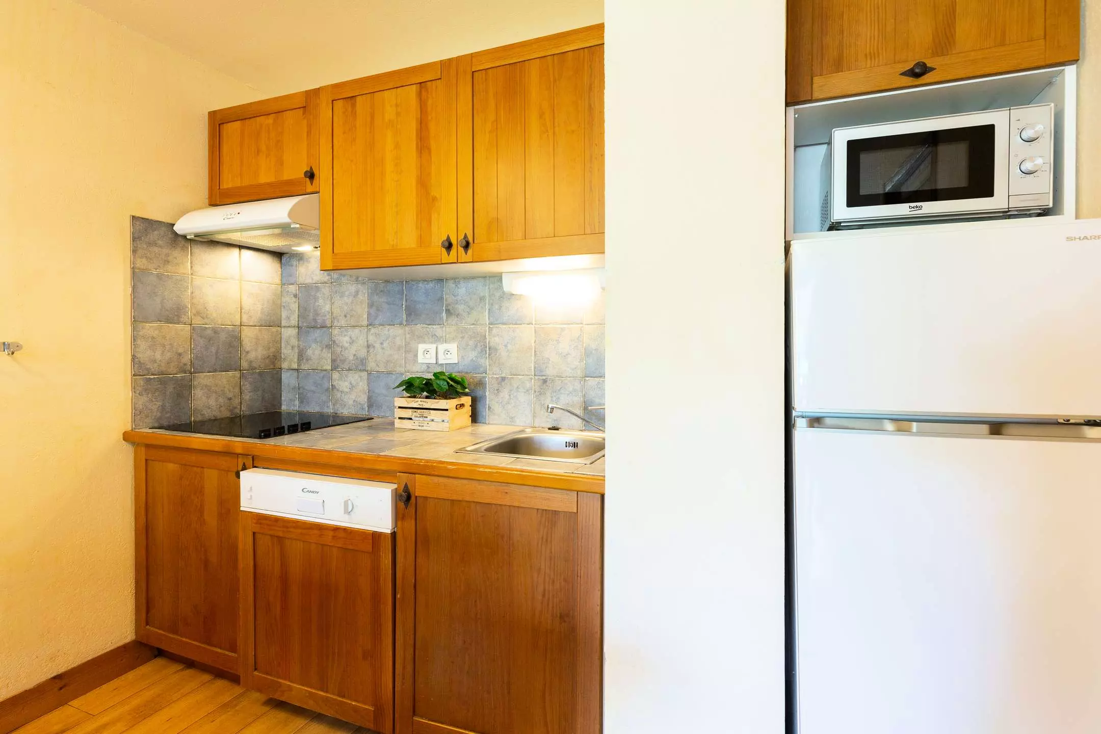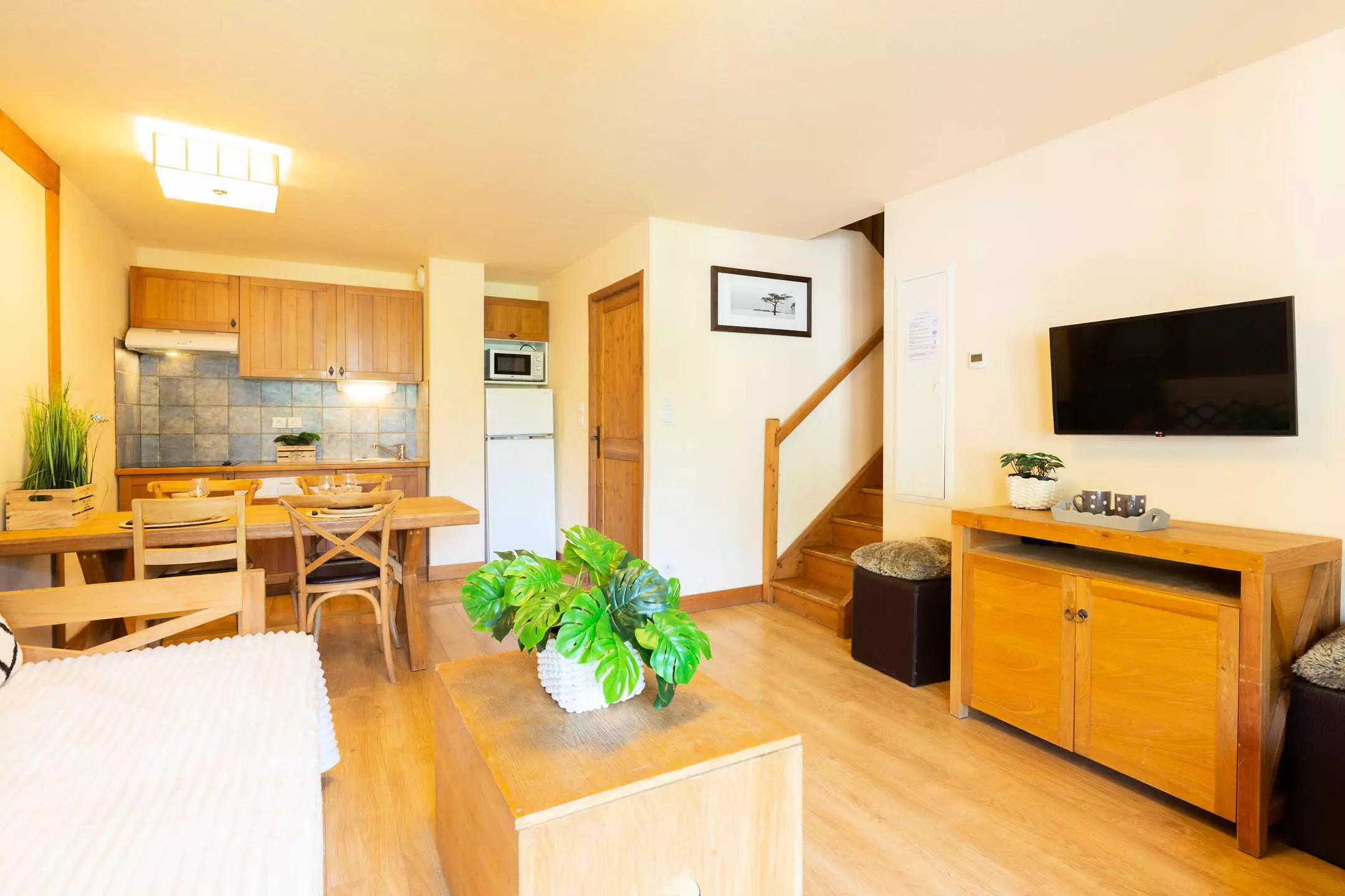 -A living room with 1 double sofa bed and TV, opening onto a fitted kitchen (ceramic hob, microwave, dishwasher)
