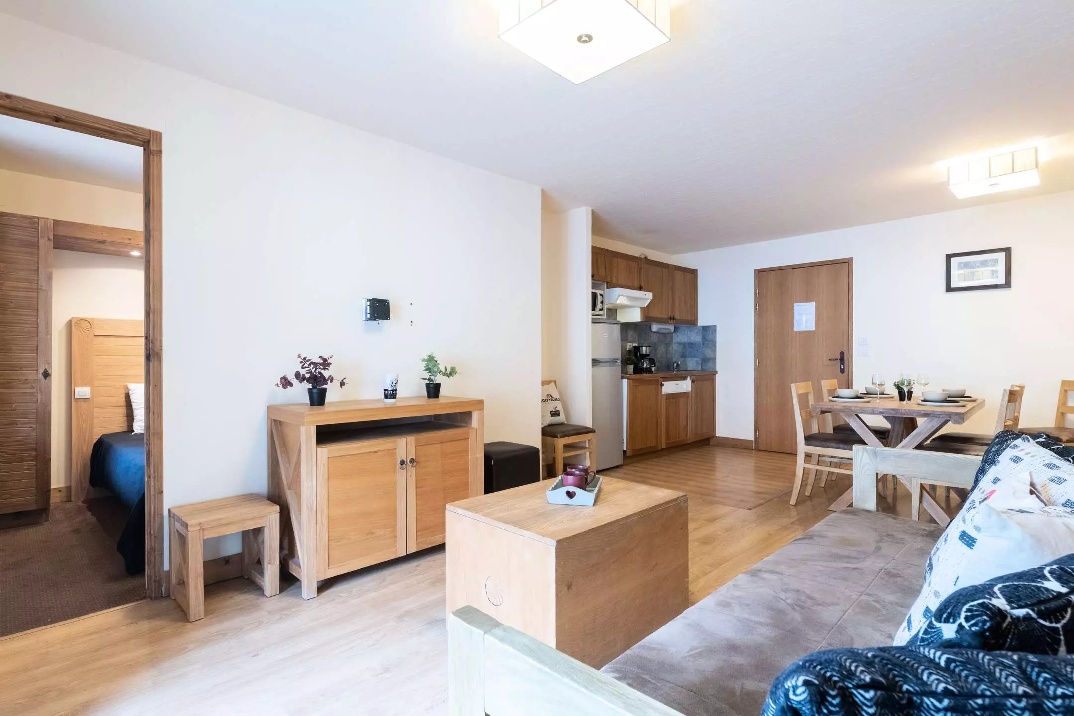 -A living room with 1 double sofa bed and TV, opening onto a fitted kitchen (ceramic hob, microwave, dishwasher)