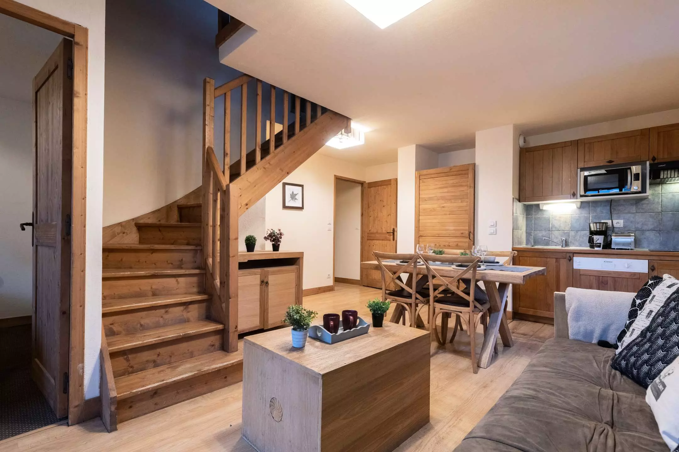 -A living room with 1 double sofa bed and TV, opening onto a fitted kitchen (ceramic hob, microwave, dishwasher)