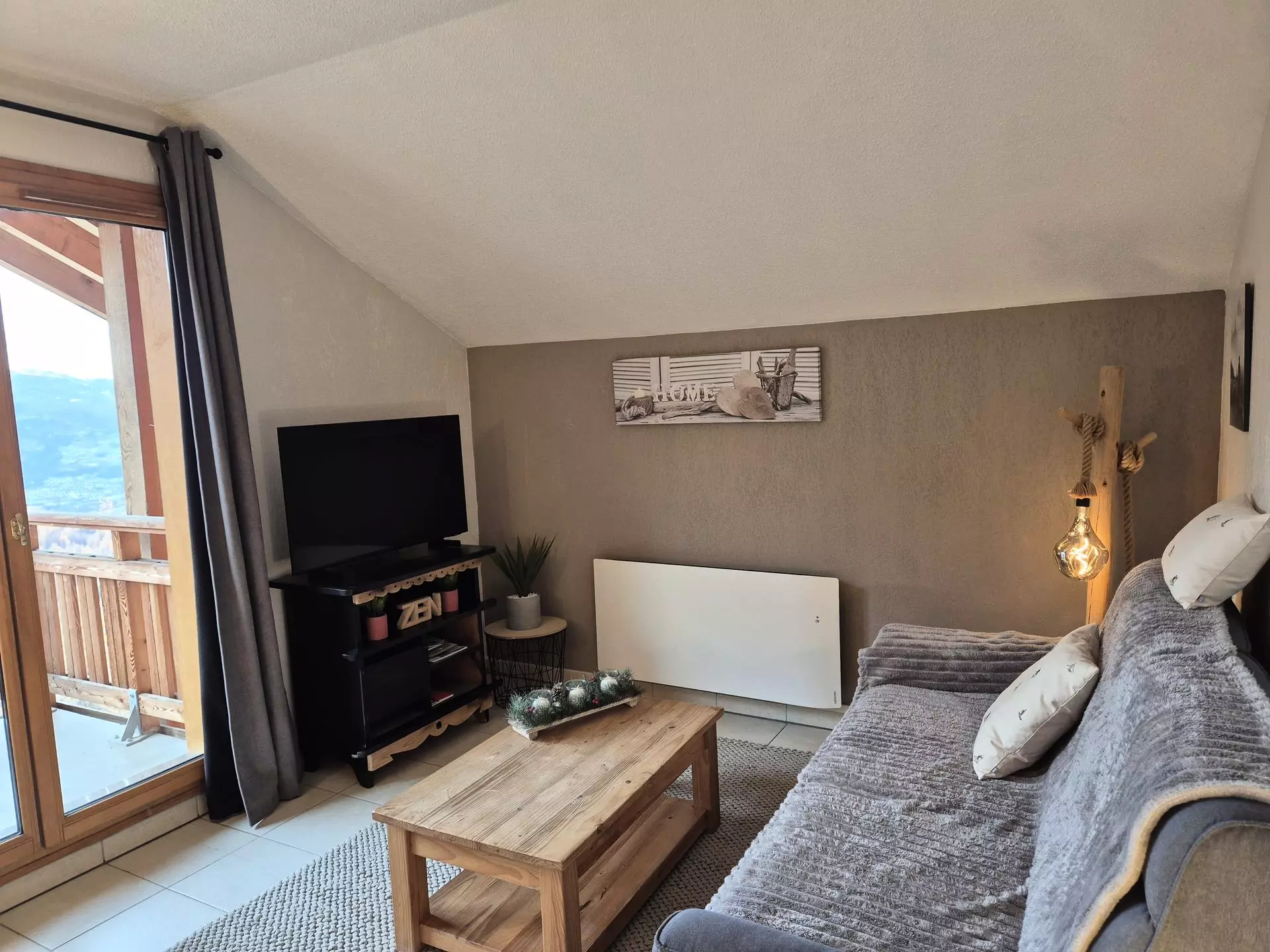 This superb, fully renovated apartment is located on the fourth floor of its residence and offers an exceptional view of the surrounding larch forest and the summit of La Mazelière.