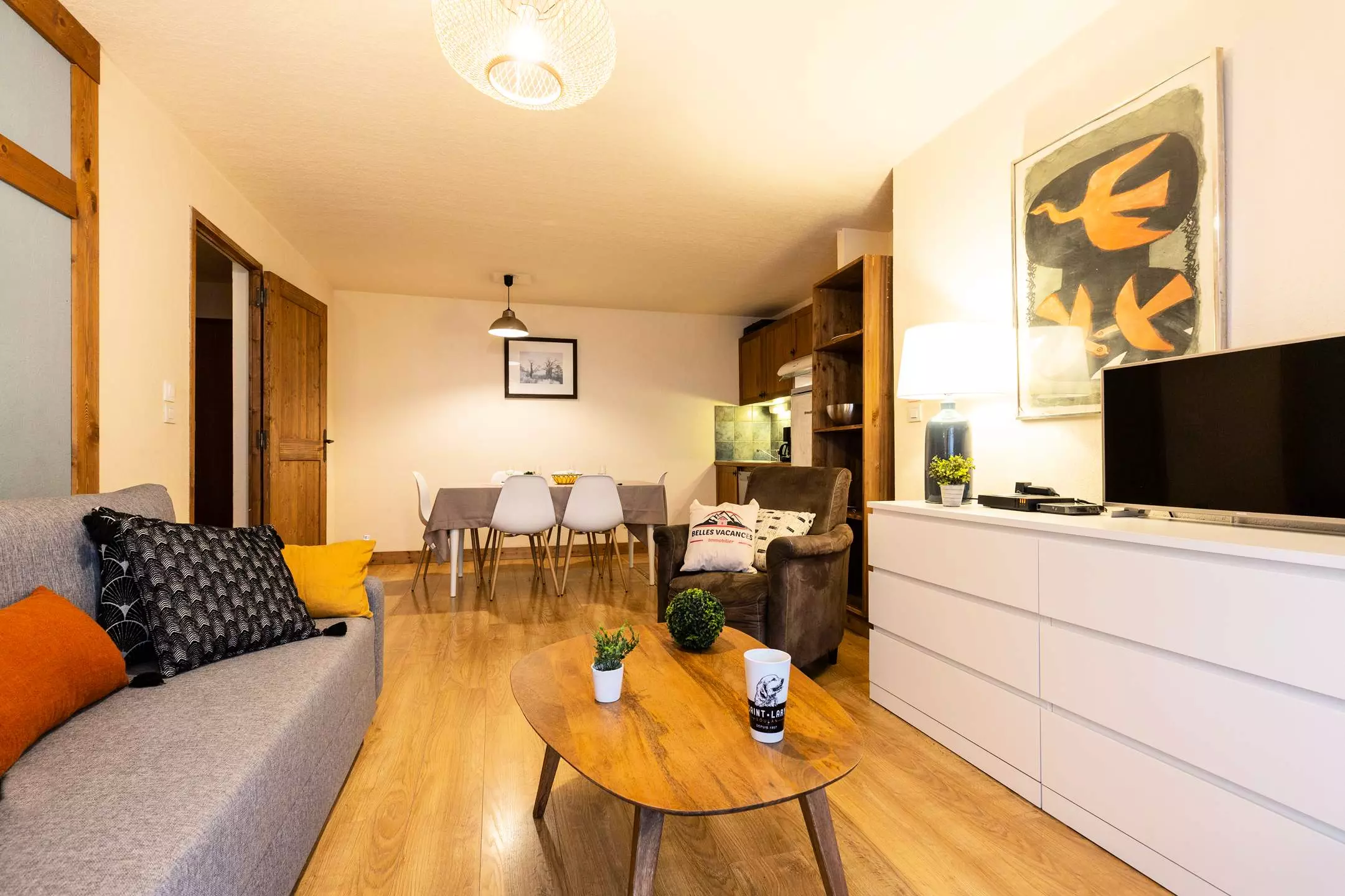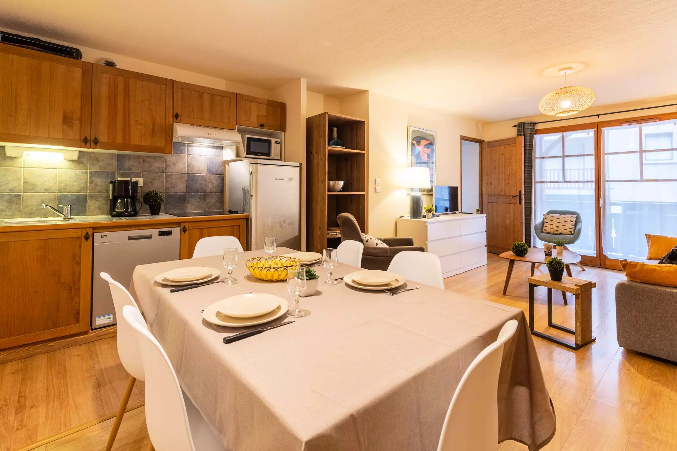 -A living room with 1 double sofa bed and television, opening onto a fitted kitchen (ceramic hob, microwave, dishwasher)