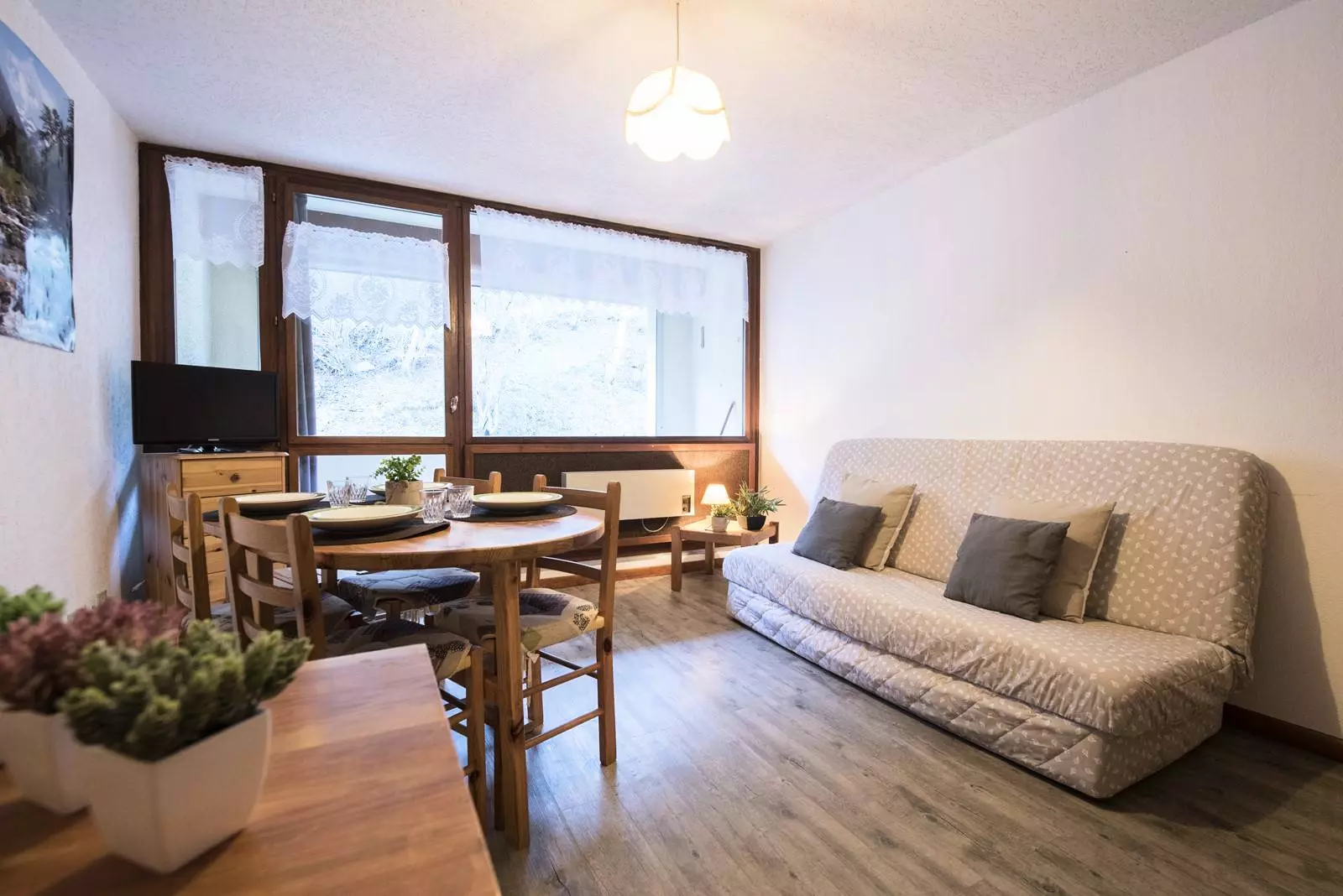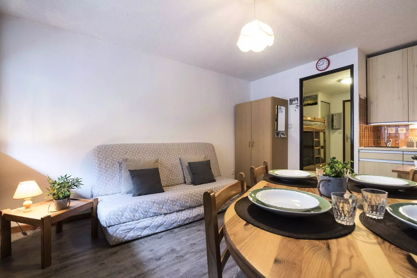 The main room consists of an equipped kitchenette, a living room with a double sofa bed, and a television.