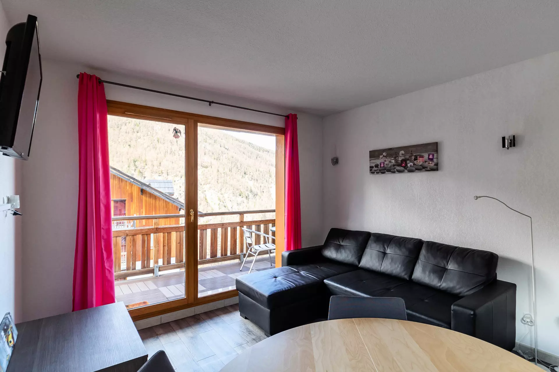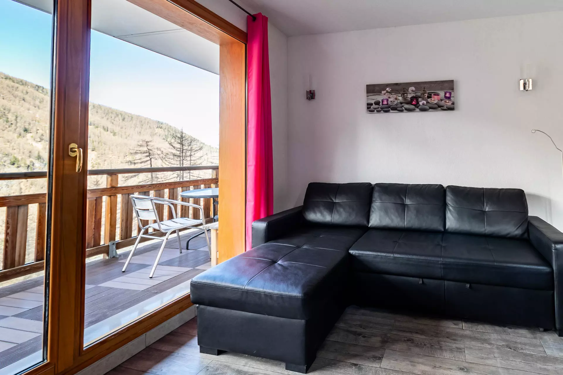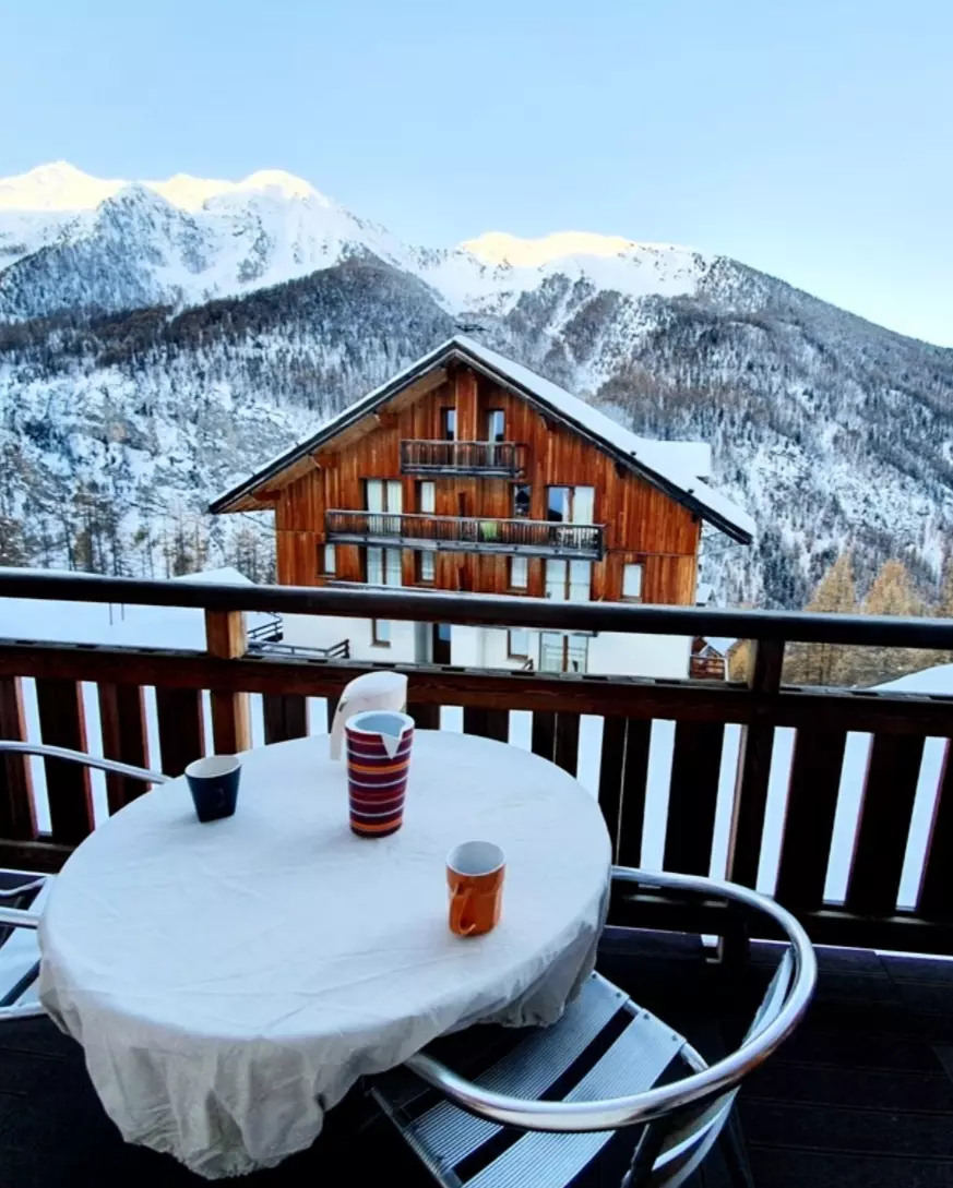 The large L-shaped balcony with garden furniture invites you to have lunch in the sun, with a southwest exposure overlooking the slope which leads to the resort and a view of the valley.