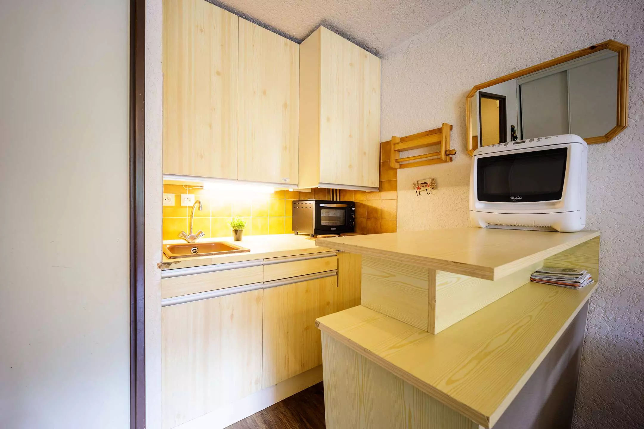 Finally, the kitchen area equipped with mini-oven and microwave opens onto the living room.