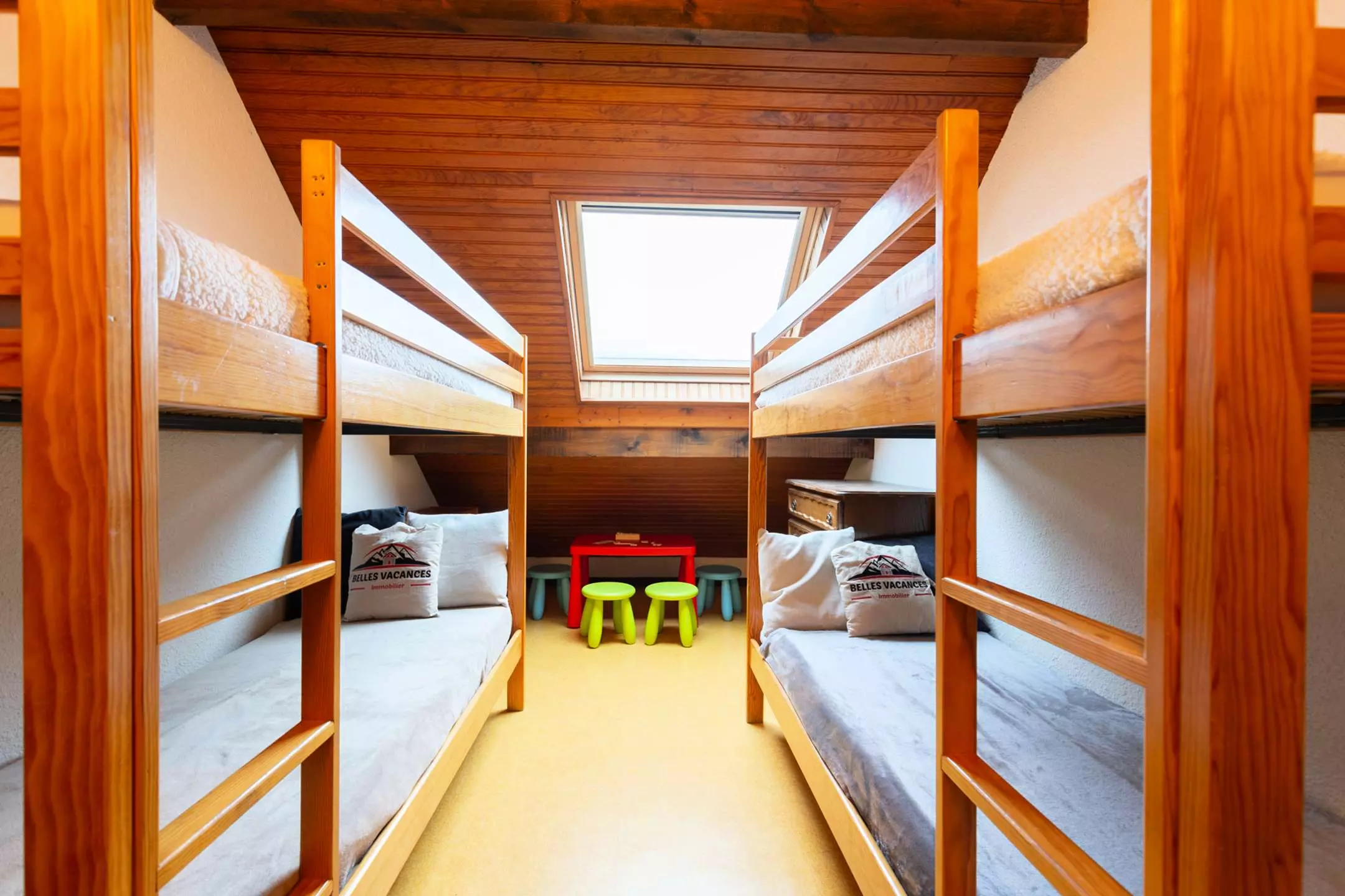On the second level, 2 bedrooms. The has a double bed and the second has 2x2 bunk beds and a play area for children.
