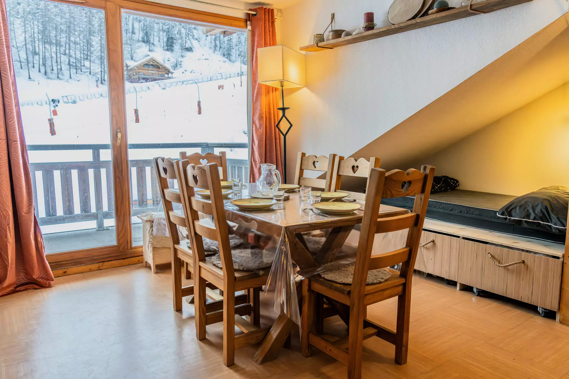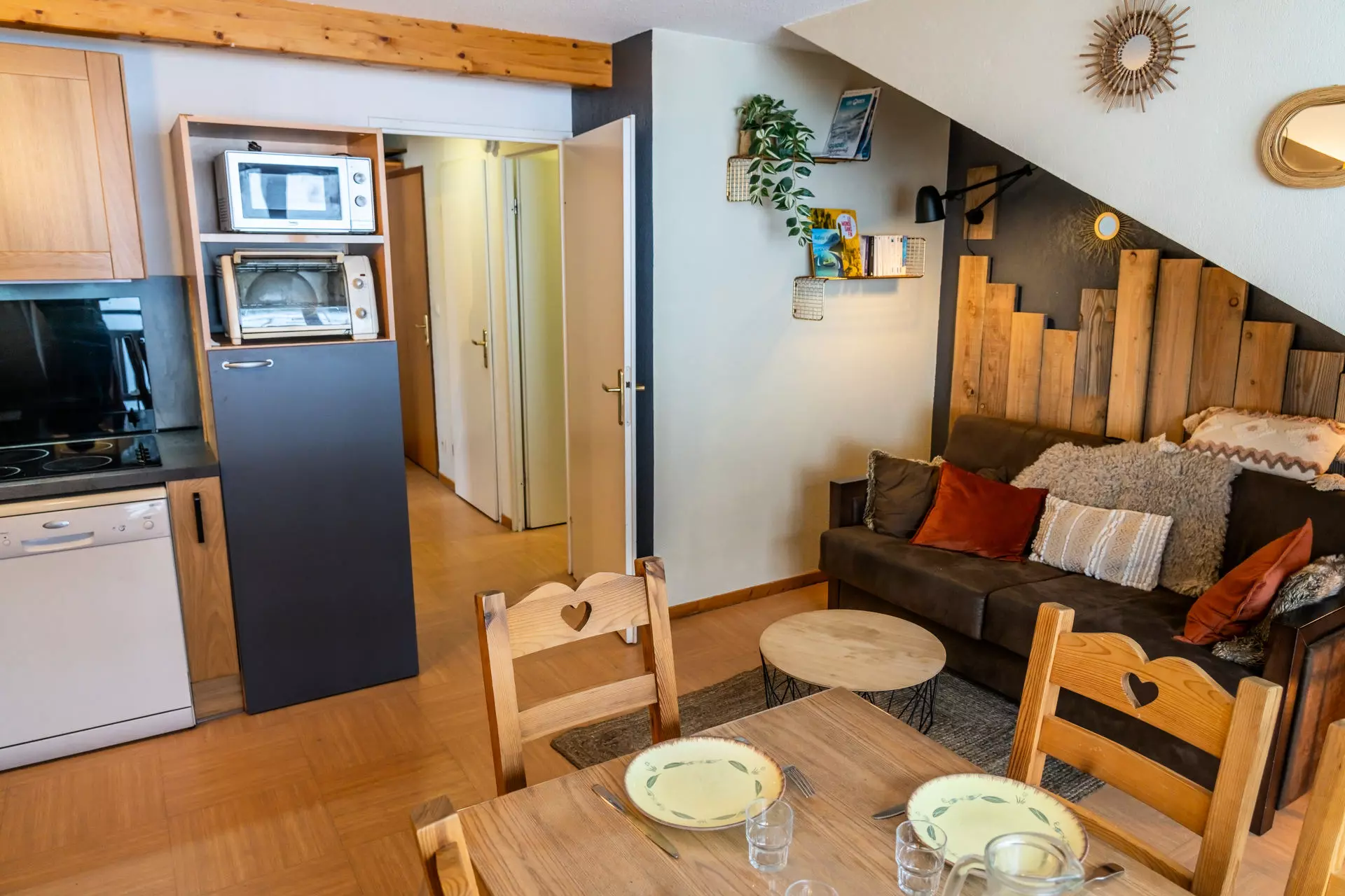 The living room consists of a lounge area with a sofa and a very well-equipped kitchen with an oven, dishwasher, microwave, hob, refrigerator, raclette machine, etc. The dining table can accommodate 7 guests to share mountain specialties with those you love.