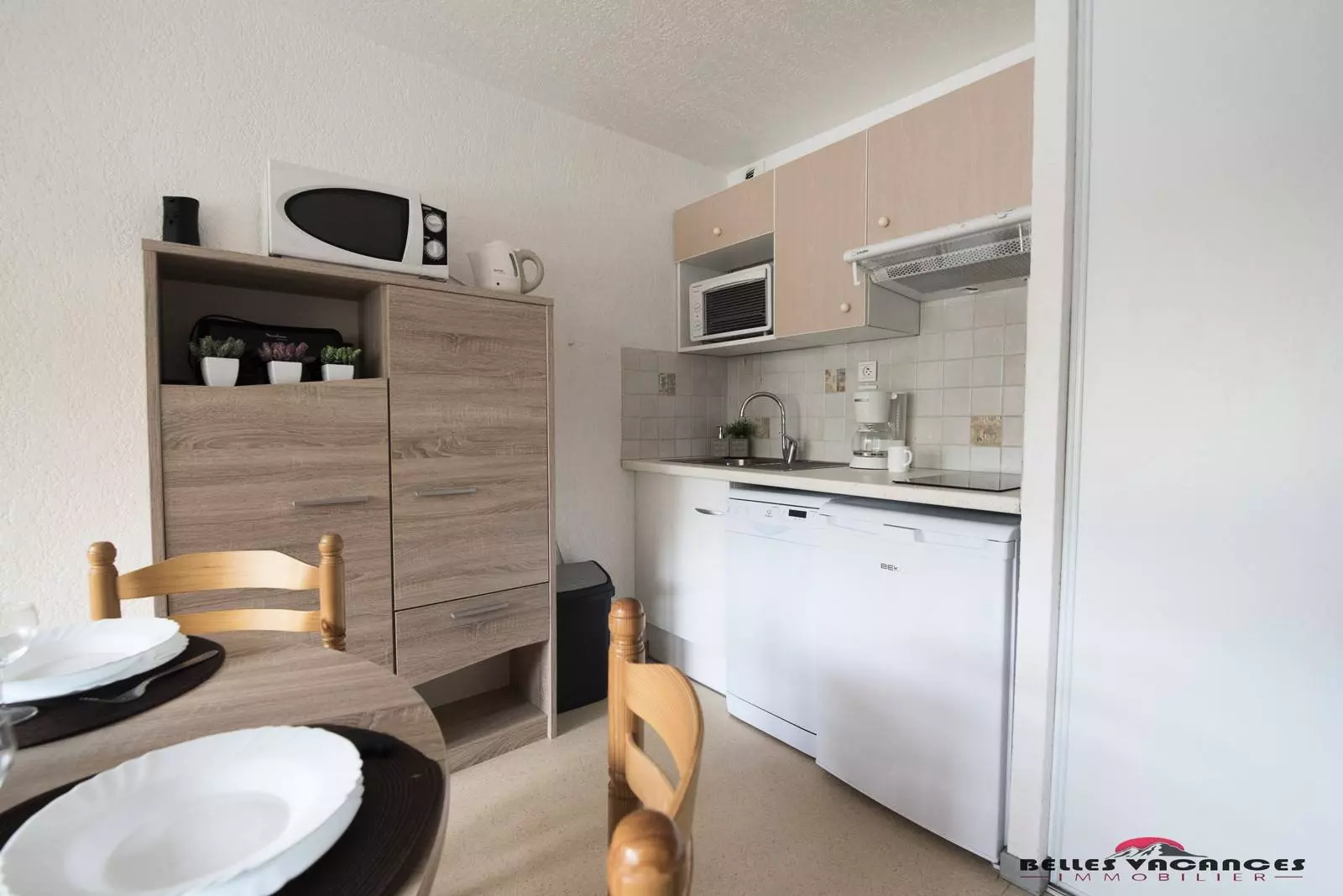 A kitchenette open to the living room (with mini-oven and microwave, 1 vitro hob (3 burners), dishwasher)