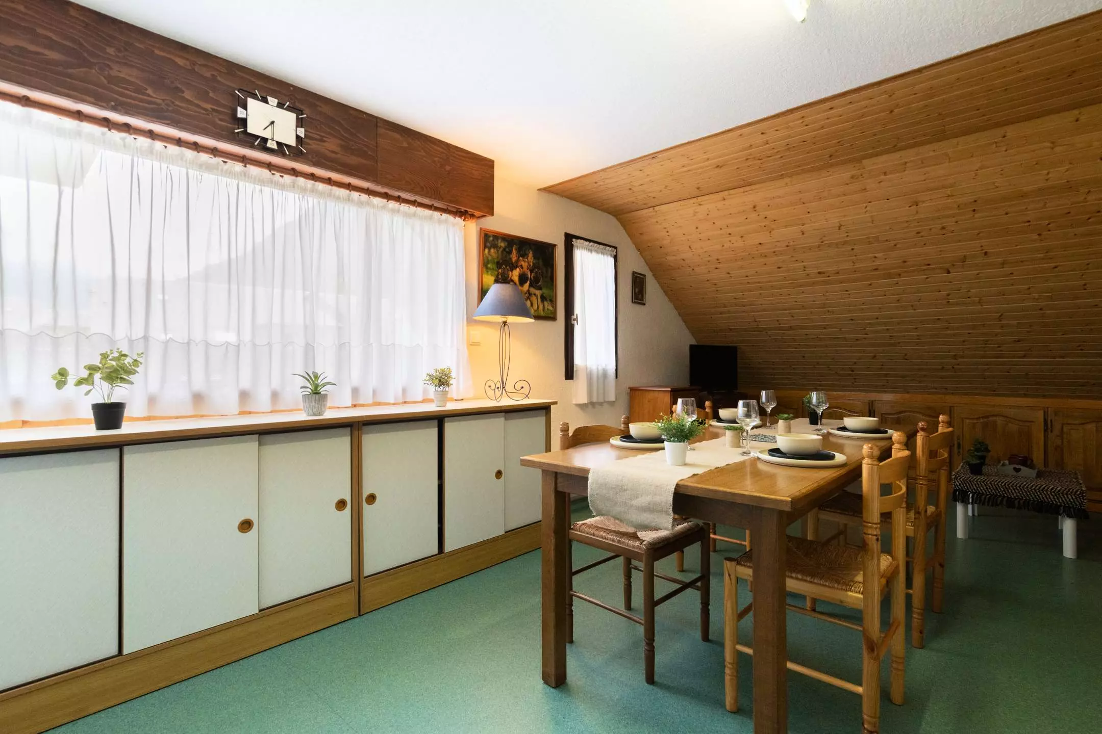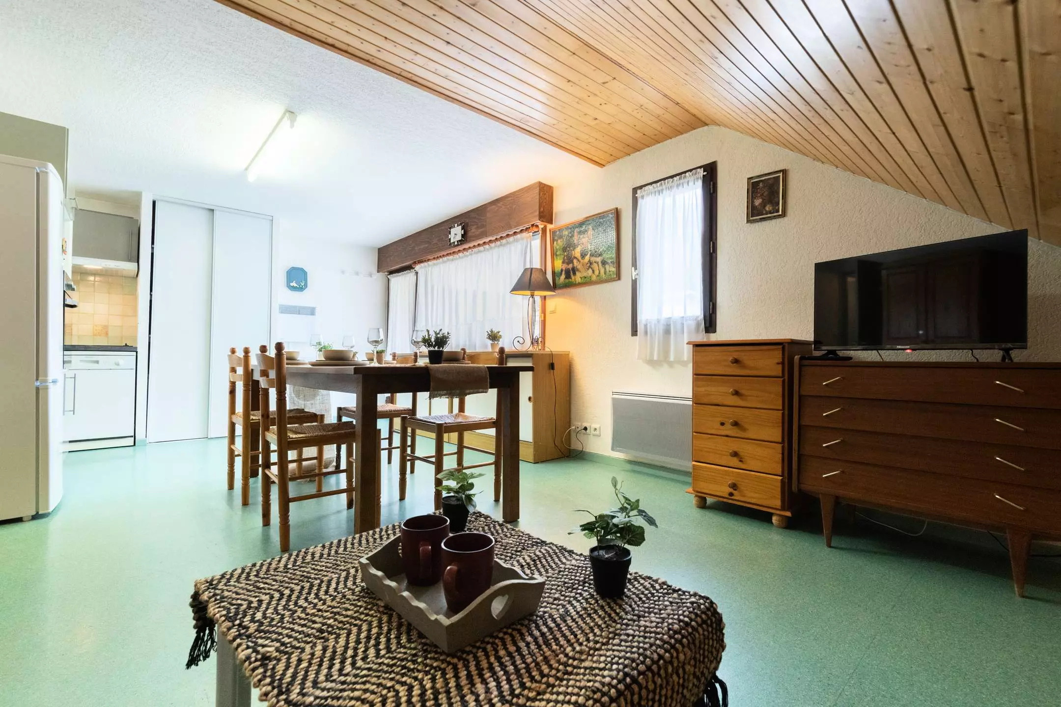 The living room offers a sofa and a flat screen as well as a large dining room table to accommodate many guests.
